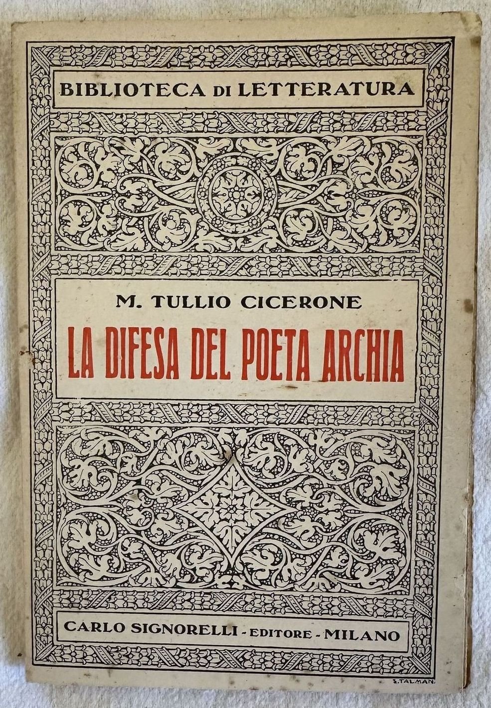 Edizione Signorelli della collana "Biblioteca di letteratura" dell'opera classica "La Difesa del Poeta Archia" di Marco Tullio Cicerone. Traduzione di Angelo Ottolini. L'opera è completa. Graziose brossure con decorazioni. In ottime condizioni. Copertina editoriale in buone condizioni con lievi usure ai margini e dorso. Legatura in buone condizioni. All'interno le pagine si presentano in buone condizioni con fioriture. In 16. Dim. 15x10,5 cm. Pp. 35+(1).Signorelli edition of the series "Biblioteca di letteratura" of the classic work "La Difesa del Poeta Archia" by Marco Tullio Cicerone. Translation by Angelo Ottolini. Nice decorations on the covers. In very good conditions. Editorial cover in good conditions slightly worn in the edges and spine. Binding in good conditions. Inside pages are in good conditions with foxings. In 16. Dim. 15x10,5 cm. Pp. 35+(1).