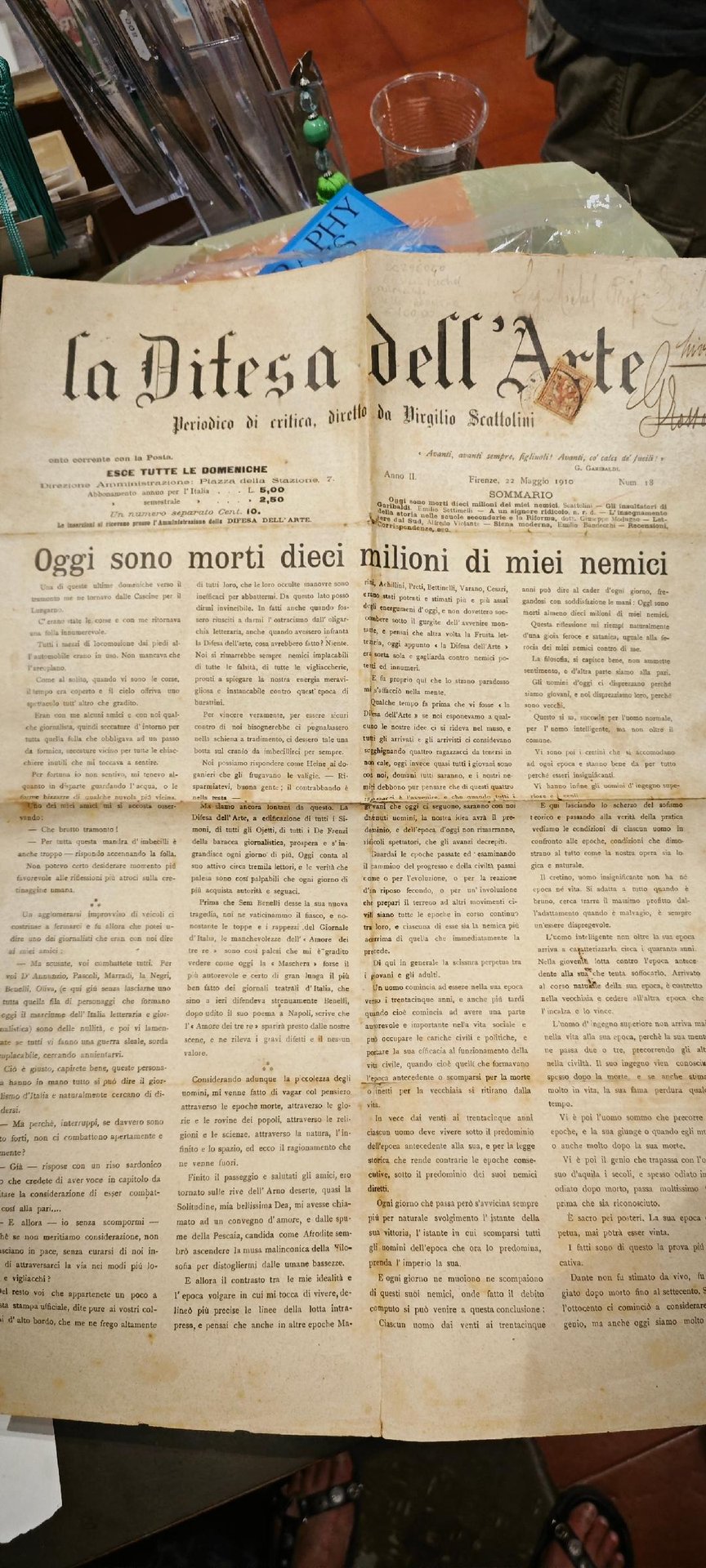 35x50, giornale di 4 pagine, Firenze 1910, la prima pagina presenta un bollo e firma di appartenenza di Ersilio Michel, storico e biografo importante per la storia risorgimentale. buone condizioni generali rarissimo da collezione