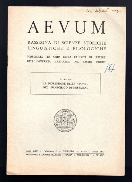 Opuscolo vintage. Aevum, rassegna di scienze storiche, linguistiche e filologiche. ANNO XXVI - FASCICOLO 2 ESTRATTO MARZO APRILE 1952. Segni di biro in copertina. Piega centrale. Ordinario segno del tempo.