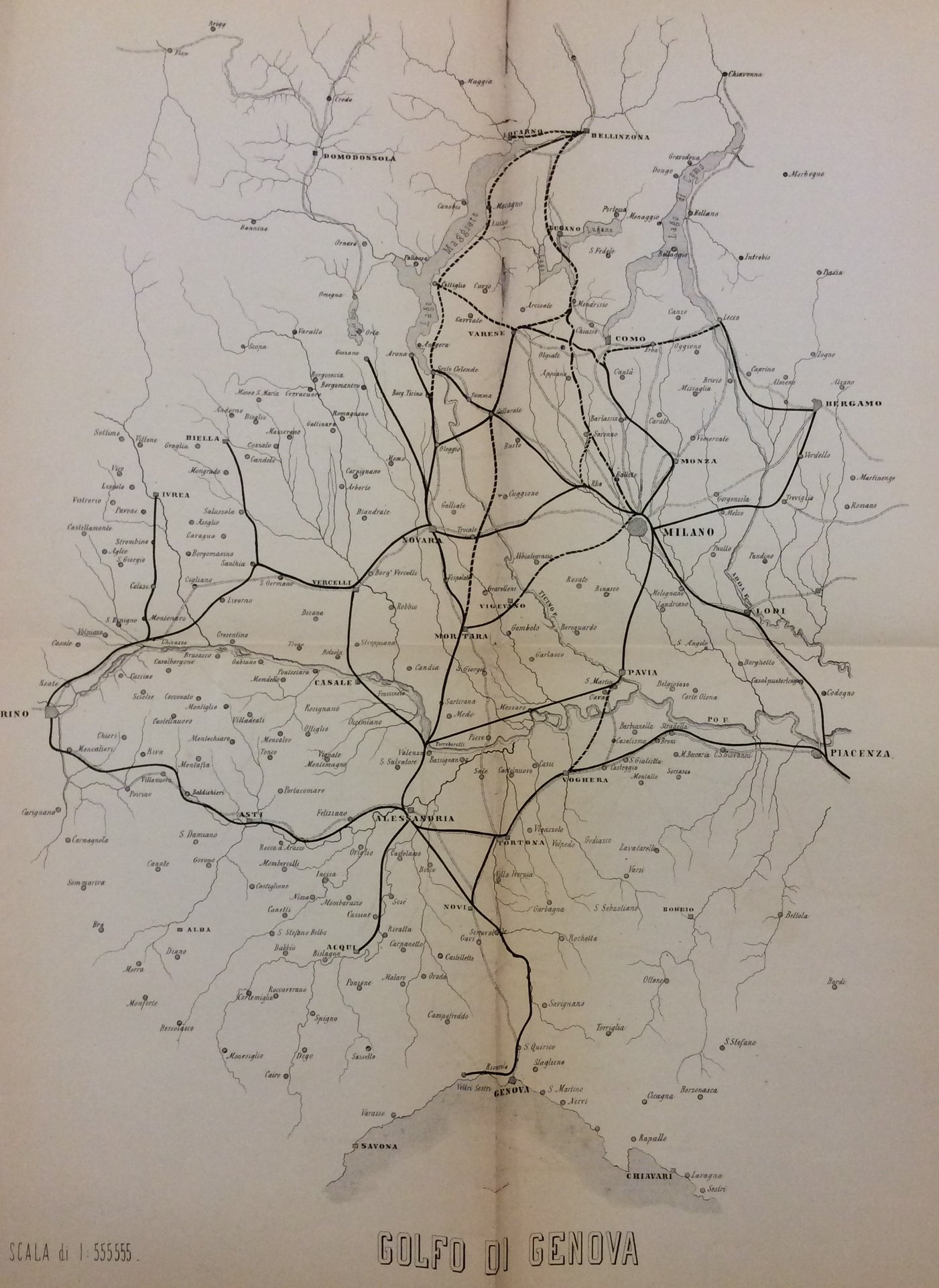 In-8 gr. (mm. 282x187), brossura originale, pp. 72, con 1 carta geografica (Piemonte, Liguria e Lombardia), più volte ripieg. e fuori testo, in scala 1: 555 555. Importante Memoria. Esempl. intonso, ben conservato.