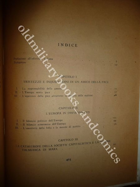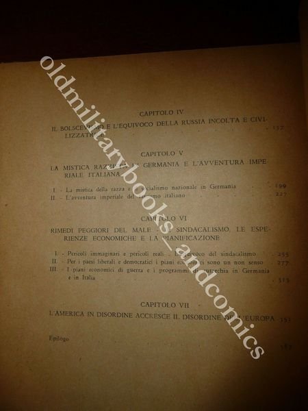 DESCRIZIONE: Editrice Faro Roma 1945 I^ Ed., br. ed. con sovracc. ill. con alette pp. 406 in 8°. Il presente saggio uscí per la prima volta in Francia nel 1938. Il Nitti, illustre economista e uomo politico, esule fino al '45, previde con lucida intuizione l'inevitabilità della guerra, e ne additò le cause nell'ideologia totalitaria comune a bolscevismo, fascismo, nazionalsocialismo. Tipica, uniforme ingiallitura della carta post-bellica. Indice completo in foto. CONDIZIONI: Buone/Ottime. PESO / WEIGHT: 413 gr. without package