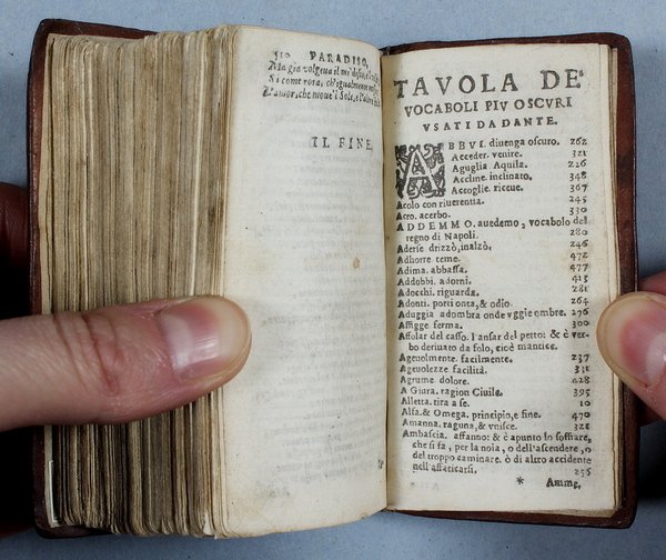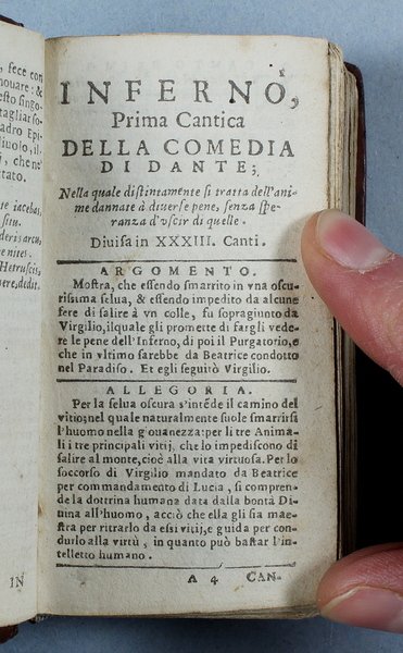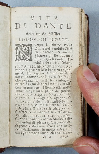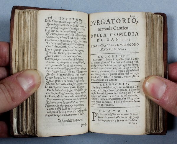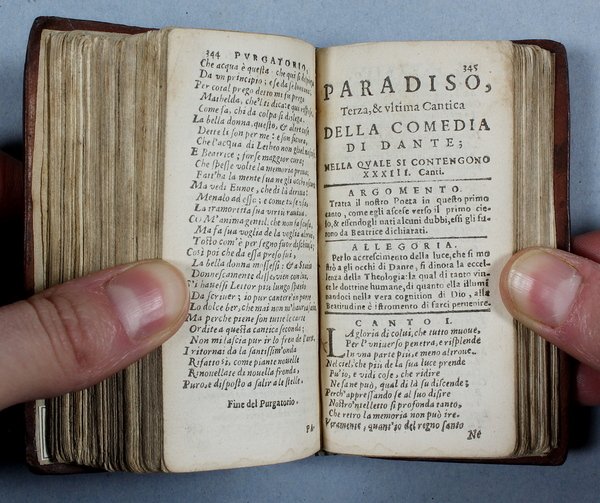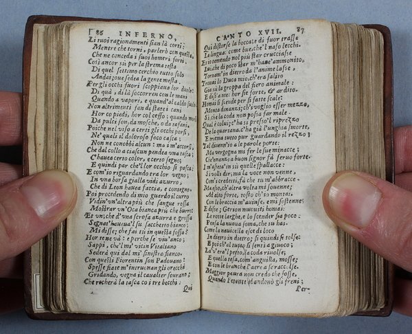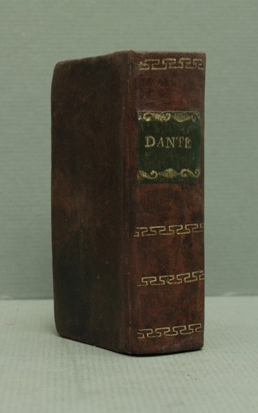 Questa rara edizioncina della Divina Commedia, riveduta da Angelo Cantini, Š la terza ed ultima del secolo XVII dopo quella vicentina del 1613 del Leni e quella padovana del 1629 del Pasquardi che erano uscite con il titolo "La Visione". Tutte le tre edizioni seicentesche riproducono il testo dell'edizione del 1555 curata da Ludovico Dolce. Rispetto alle precedenti questa Š in formato pi— piccolo e riporta all'inizio del volume la vita di Dante compilata dal Dolce. E' importante sottolineare che a partire dal 1629 per oltre 70 anni non fu mai stampato il poema dantesco. Questa "assenza" non Š certo una casualit…, ma una reale caduta di interesse nei confronti della Commedia dovuta a diversi fattori, non ultimo una opposizione della Chiesa che nel corso di quegli anni era in piena attivit… controriformista. Per buona parte del secolo XVII la lettura di Dante sarebbe stata quindi possibile solo a chi avesse ritrovato in antiquariato una vecchia edizione del poema. "Gi… dal De Batines questa bella edizioncina venne annoverata tra le pi— rare. Essa Š divenuta ormai quasi introvabile. Ô stampata in carattere corsivo microscopico e preceduta dalla Vita di Dante scritta da Lodovico Dolce" (Olschki, Dantesca 1902, nø 61). Mambelli 55, che ne possedeva una copia incompleta delle prime 3 carte, per errore la intitola "La Visione". De Batines I, p. 102. Fiske I, p. 10. Haym II, 13.