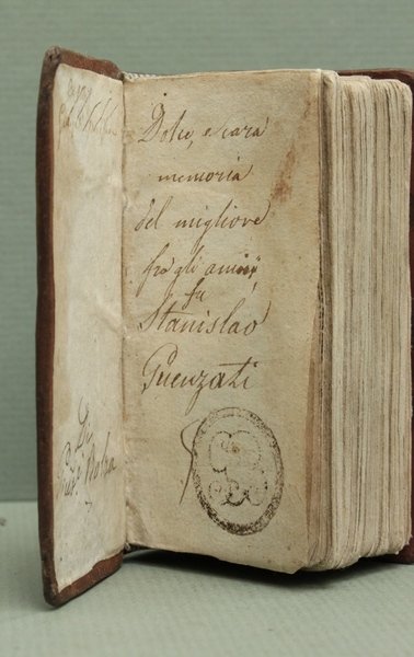 In-24ø; 3 cc. (compreso il frontespizio inciso), 510 pp., 12 cc.; legatura settecentesca in tutta pelle, tassello in marocchino con titolo e fregi in oro al dorso (minimo restauro alla cuffia superiore e a due angolini). Firma di possesso di Stanislao Guenzati e del conte Giuseppe Molza: il suo monogramma Š stampigliato alla carta di guardia. Piccola mancanza al margine bianco alle pp. 257-258 e 497-498 che non coinvolge lo specchio di stampa.