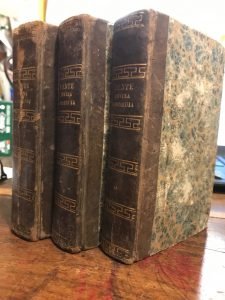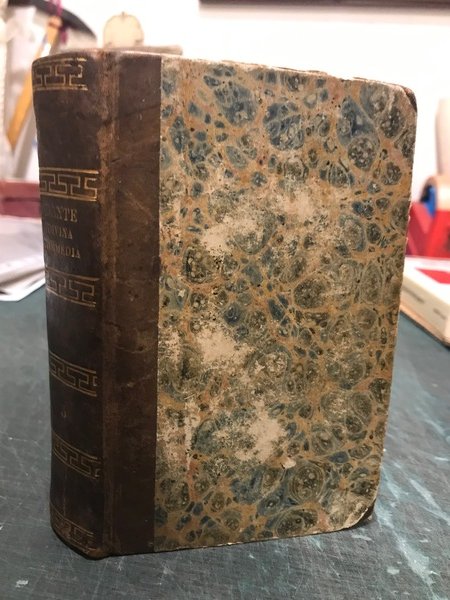 .Nuova edizione a miglior lezione ridotta, ed arricchita d'inedite postille del Dottor Giovanni Lami e di P.J.Fraticelli. 3 volumi. Ogni volume reca un'incisione in antiporta : ritratto di Dante al vol. I, e schema dell'inferno al canto primo, schema del purgatorio al vol. II e schema del Paradiso al vol. III. Schema a doppia pagina con la "Principale allegoria della Divina Commedia", Figure simboliche del Canto primo e Canto secondo. Disegni a inchiostro e matita e timbro di vecchio proprietario alle sguardie ant. del vol. I, timbro presente anche alla sguardia ant. del vol. II e al retro dell'antiporta del vol. III., quest'ultimo con dedica d'epoca alla sguardia ant. Spellatura dorso del vol. 1,e qualche abrasione alla carta dei piatti, macchioline d'inchiostro a pagg.33-34 (vedi foto), ordinari segni del tempo, ma più che buono lo stato dei 3 volumi. Pagg. XXXVII, 432,2; 432;448. Mezza pelle coeva con tit e fregi oro al dorso. Mis mm 145x90