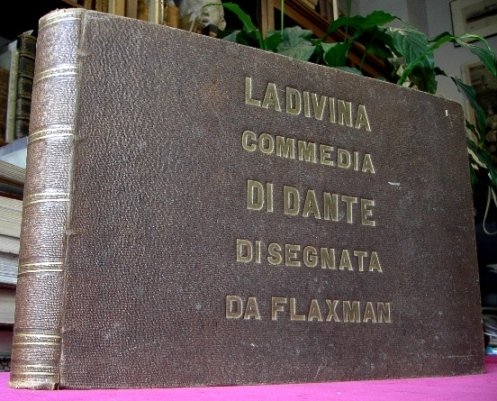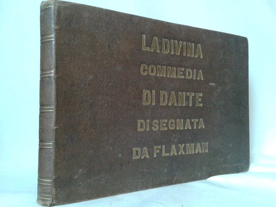 Album in 4, formato oblungo (cm. 22 x 33), legatura in tela editoriale, dorso ornato e titolo inciso in oro al piatto, sguardie colorate, frontespizio figurato, 110 incisioni al tratto di Lasinio su invenzione di Flaxman. Rara edizione ottocentesca di una importante raccolta iconografica della 'Divina Commedia', pubblicata la prima volta in suite editoriale a Roma nel 1793. Un'opera rivoluzionaria nell'interpretazione iconografica dantesca, capolavoro dello scultore inglese John Flaxman, corrispondente e allievo di William Blake, interprete dei canoni del neoclassicismo e ispiratore dell'arte di Ingres. Le incisioni raffigurano le cantiche del capolavoro dantesco, con citazione del verso di riferimento. Opera completa, collazionata, in pi che bello stato. Preziosa.