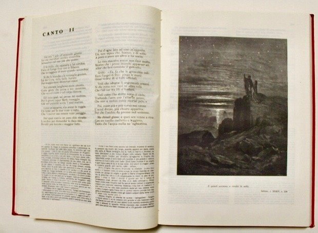 In Folio (mm 380x265); pagg. 565+indice con raffinate illustrazioni in silografia a piena pagina. Legatura editoriale in tela rossa con titolo impresso in oro al piatto e al dorso. Edizione del secondo dopoguerra della celebre Divina Commedia illustrata da Gustavo Dorè, pubblicata per la prima volta nel 1868. Dorè fu uno straordinario illustratore, nato a Strasburgo il 6 gennaio 1832 e morto a Parigi il 23 gennaio 1883, considerato uno degli illustratori di libri più prolifici e di maggior successo del tardo diciannovesimo secolo. Bell'esemplare. <BR>