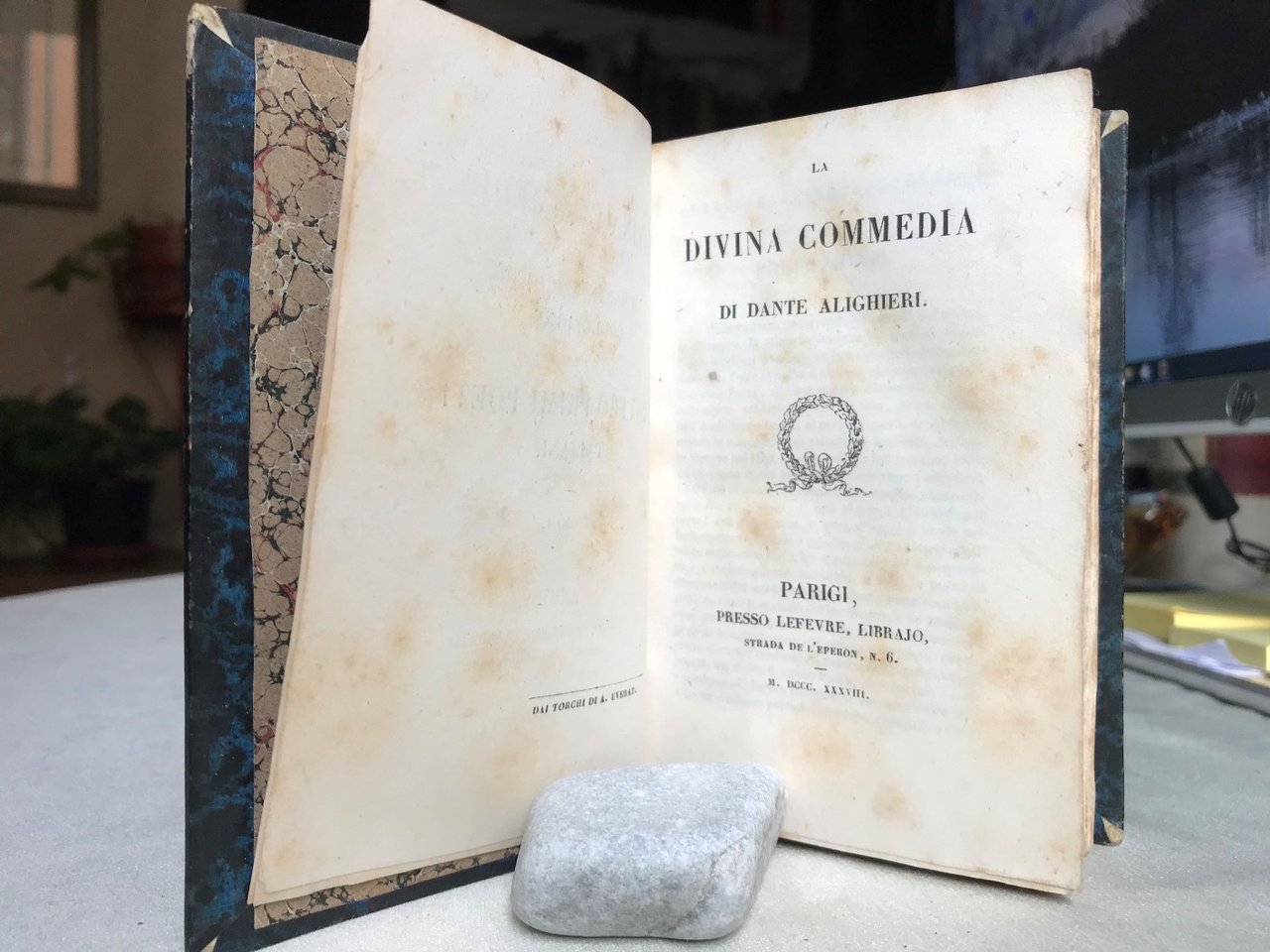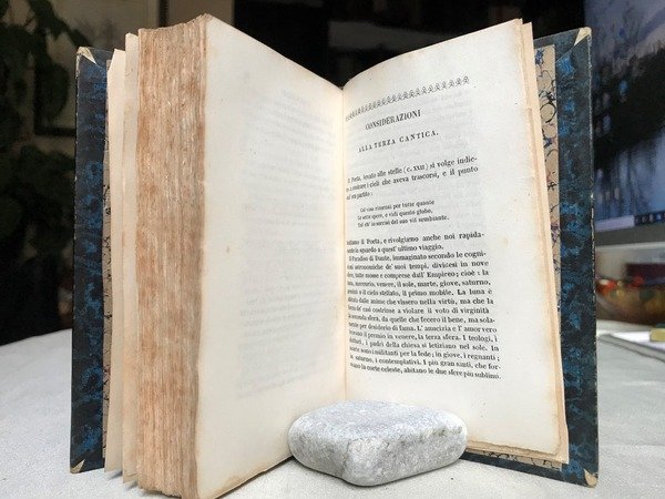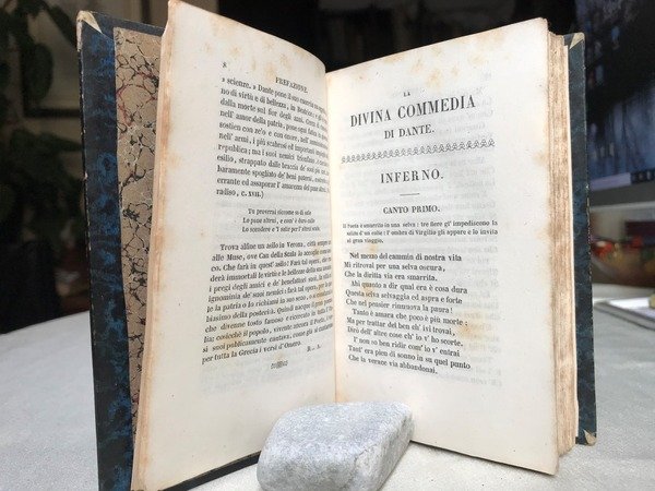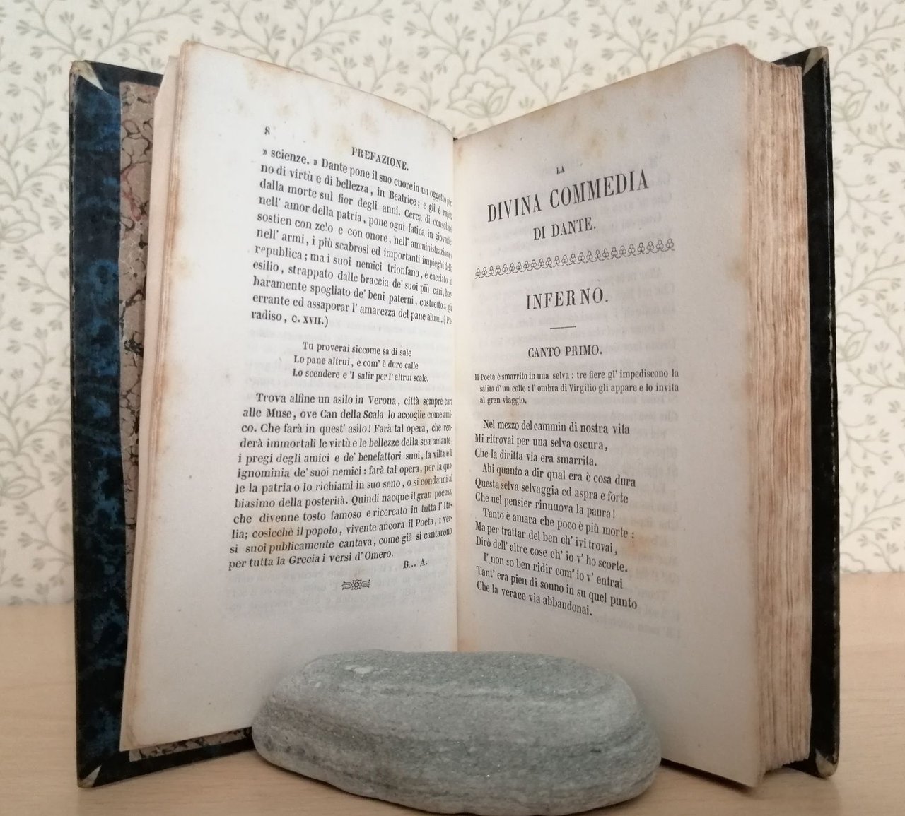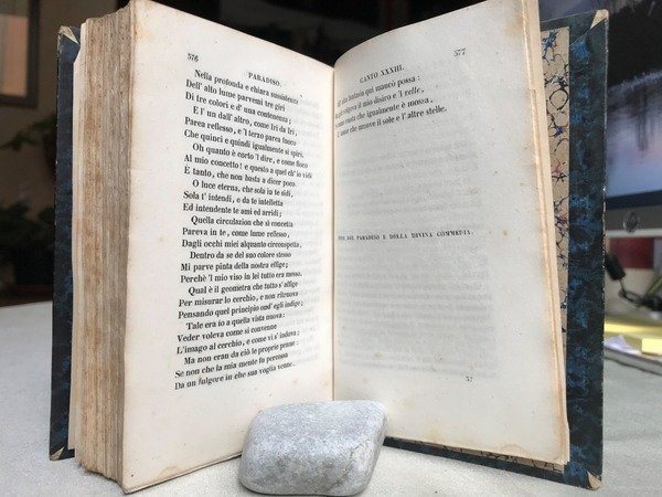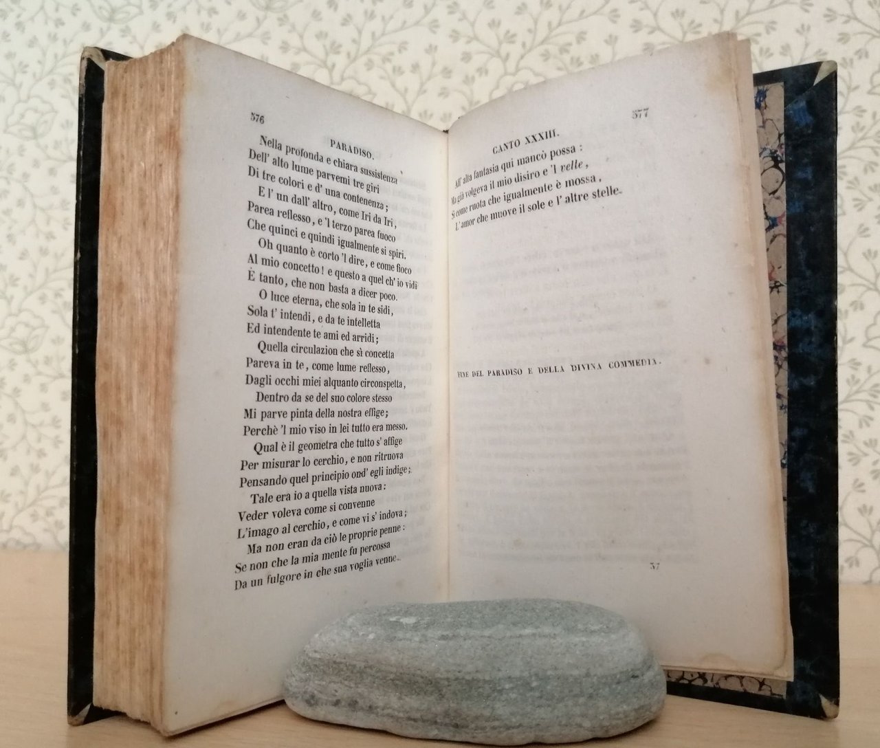 Volume in 12 legato in mezza pelle, titolo al dorso ornato in oro, sguardie marmorate, bianca, occhiello della collana, frontespizio, 583 pp. Bella, minuscola edizione del Poema, corretta e glossata. Fa parte della collana 'I quattro primi Poeti d'Italia'. In ottimo stato, carta finissima e frusciante, sporadiche, ininfluenti fioriture. Poco comune