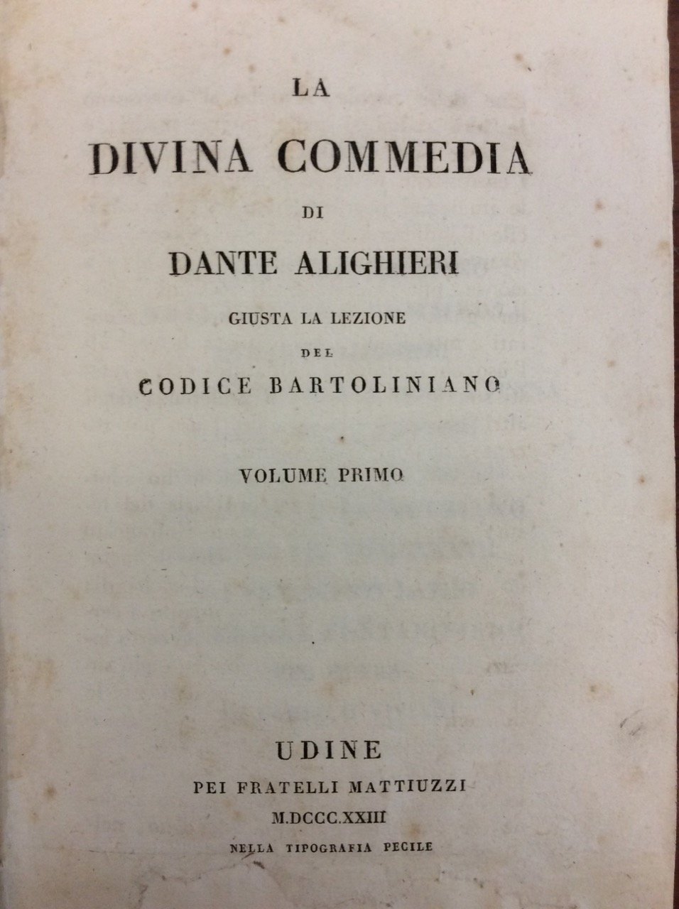 In-8 gr. (mm. 207x130), 3 volumi in 4 tomi, mz. pelle coeva, titolo oro al dorso, pp. (42),LXXII,(2),330; (2),272;265,(7); LI,790; VII,(3),323; con 2 tavole fuori testo di cui 1 e' una bella inc. su rame dal Lose che rappresenta Dante alla grotta di Tolmino. "Publie sous la direction de Quirico Viviani, d'apres un manuscrit du XIV siecle, presentant une foule de lecons non encore recueillies, et aussi avec le secours de 65 manuscrits ou editions anciennes.. cette edition doit etre placee au rang des plus importantes de ce poete", come cita il Brunet,II,508 - De Batines,I,157. E ancora il Gamba,406: "In questa udinese ediz. si trovano per la prima volta gli "Argomenti" dei "Capitoli della Commedia" tolti da un Codice Trivulziano, ed i "Frammenti in versi latini dell'Inferno di Dante", tolti dal Codice Fontaniniano". Cfr. anche Mambelli,136 "Il Codice, posseduto dal vescovo Della Torre, fu acquistato dal Conte Bartolini da cui gli venne il nome. Il Witte.. affermava che il testo Bartoliniano potrebbe essere benissimo, se non il piu' autentico di tutti, almeno uno dei migliori".I primi due volumi sono dedicati alle tre cantiche, il terzo, in due parti, contiene: "Ragionamento sopra Dante" di F. Torti; "Il secolo di Dante", commento storico di F. Arrivabene; "Dizionario etimologico dantesco", con le parole volgari usate da Dante e le corrispondenti dei vari dialetti italiani; gli "Indici". Esempl. con fioriture intercalate nel testo, peraltro ben conservato.