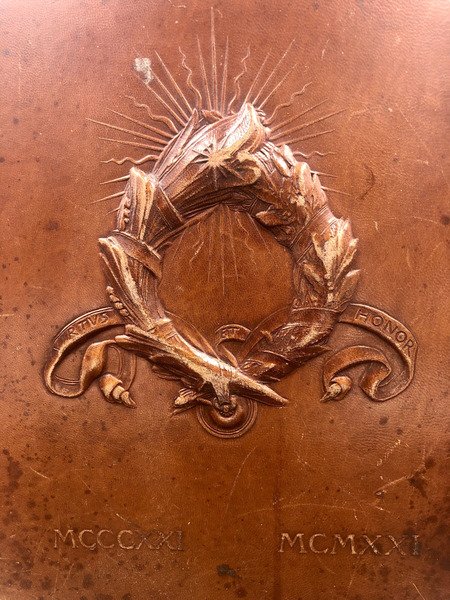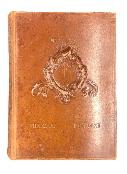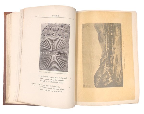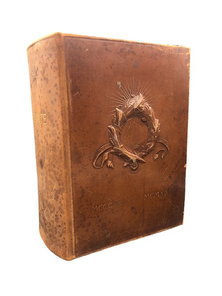 Monumentale volume in 4° (cm. 31,5x22,5 alla legarura, cm. 30x21,2 all'interno), pp. XII, (2), 1104, (1) + le 170 TAVOLE protette da veline e in carta spessa (Carta Tensi & C., Clichés Alfieri e Lacroix). Sontuosa LEGATURA in cuoio con una ghirlanda d'alloro e cartigli (virtus - honor) sbalzata a forte rilievo e MCCCXXI MCMXXI a secco al piatto anteriore; fiamma a rilievo e "Dante" in oro fra due stelle a secco al dorso. Antiporta con ritr., titolo in rosso e nero. Tagli in barbe. Eccezionale illustrazione storico-topografica della Commedia con immagini fotografiche "dal vero" per quei LUOGHI che "oggi sono su per giù quali erano al tempo di Dante", e con riproduzioni da dipinti o sculture medievali di "personaggi e oggetti che il poeta ricorda", inclusi miti e mostri. Mambelli , p. 209 n. 598. Il dorso pur integro e solido si presenta maculato e scolorito per esposizione al sole. Appena allentata la cerniera. Superbo esemplare di edizione epocale.