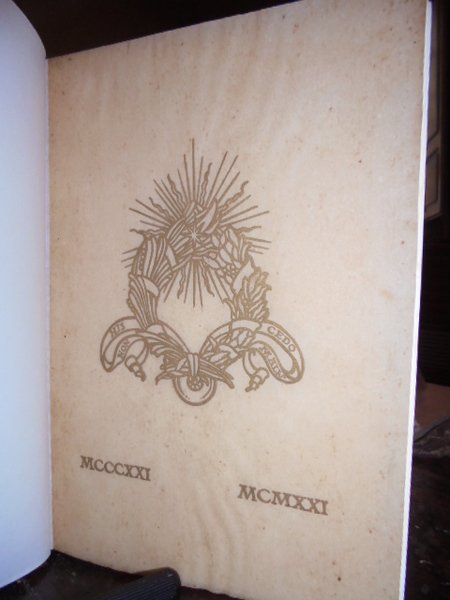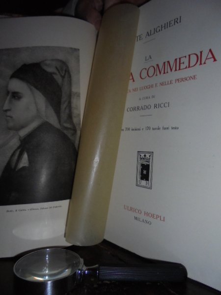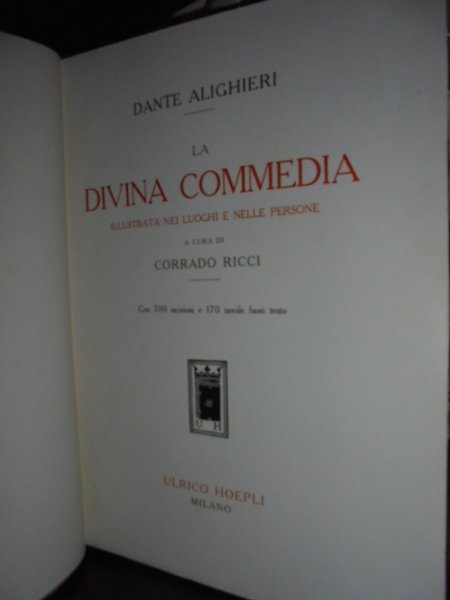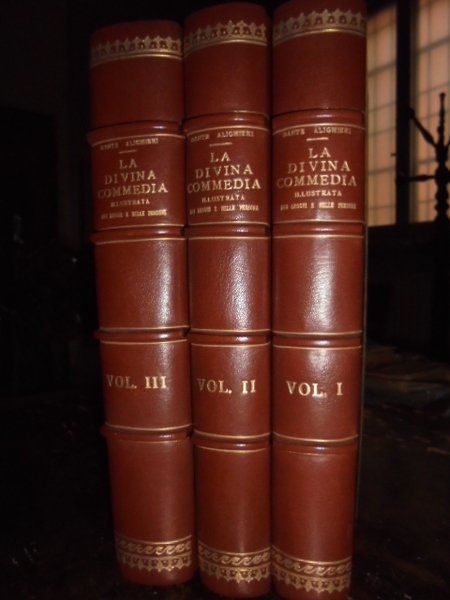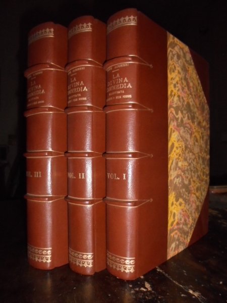 DANTE ALIGHIERI. La Divina Commedia illustrata nei luoghi e nelle persone, a cura di Corrado Ricci. Milano, Ulrico Hoepli, s.d. (1921). 3 volumi in-4°, m. marocchino cilindrato bruno con grandi angoli, dorso a nervi con titolo e decorazioni in oro, copertine originali conservate. Complessive xii, 1104, (2) pp. con 700 incisioni e 170 tavole f.t. Bellissimo esemplare in una legatura nuova. Lussuosa edizione di soli 1000 esemplari numerati, in carta fine (esempl. n° 832), rara e ricercata. Mambelli, Annali delle edizioni dantesche, 598: << Un esemplare di questa edizione del secentenario venne venduto nel 1922 (Armani) a lire 935 >>. Uff. mob. nostro a sinistra scaf. n° 5