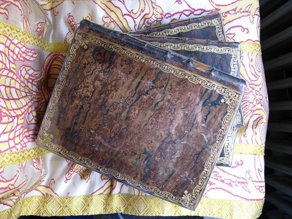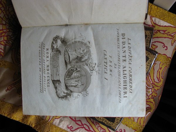 [Figurato Carta Azzurra-Legatura-Dante] (cm.26,5) voll. 3 bella legatura originale in pieno vitello marmorizzato a pi˘ colori, piatti con filetti e ricco fregio a rotella, nervi, doppi filetti e fregi floreali anche al dorso, tutto in oro compreso il titolo entro tassello, tagli rossi. Frontis + pp. XXVIII + 1 tav. + pp. 502; Frontis + 1 tav. + pp. 523 + 1 p. di imprimatur; Frontis + pp. XII + 1 tav. + pp. 541 + 1 p. nn. I frontespizi portano due medaglioni, uno col ritratto di Dante, incisi dal Pacini, le tre tavole in rame illustrano l' inferno, il purgatorio e il nparadiso. Precede la vita di Dante scritta da P. Serassi. Esemplare particolare, uno dei pochi stampati su carta azzurra, bello e raro. E' questa la prima divina commedia stampata a Roma con il testo intero, inoltre Ë la prima edizione con il valido commento di F.B. Lombardi che si Ë avvalso particolarmente dell' edizione del Nidobeato del 1478 ma anche di quelle di Foligno, Mantova e del Landino. Esemplare bellissimo fresco e nitido, perfettamente conservato. Unica menda, il solo dorso del primo volume con difetti, abrasioni e dorature sbiadite. Molto belle le legature degli altri due volumi. * Mambelli 78; * De Batines I 119; * Gamba 397; * Graesse II 331; * Saginati "Collezione Dantesca Biblioteca Berio" n∞81; * Martini "Dante Biblioteca Fondazione Marco Besso" p. 45; * Raccolta Mackenzie p. 113.[f68]