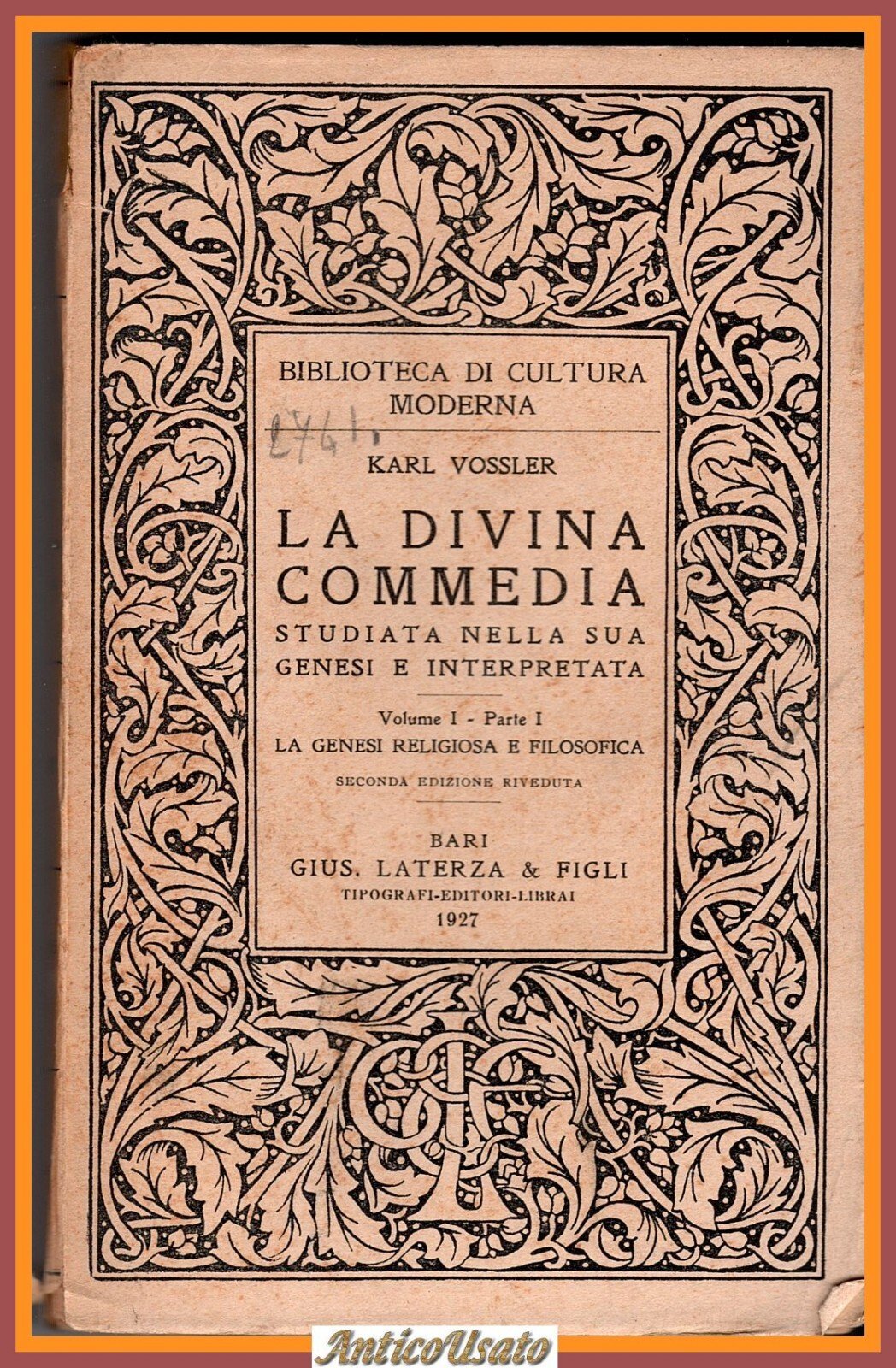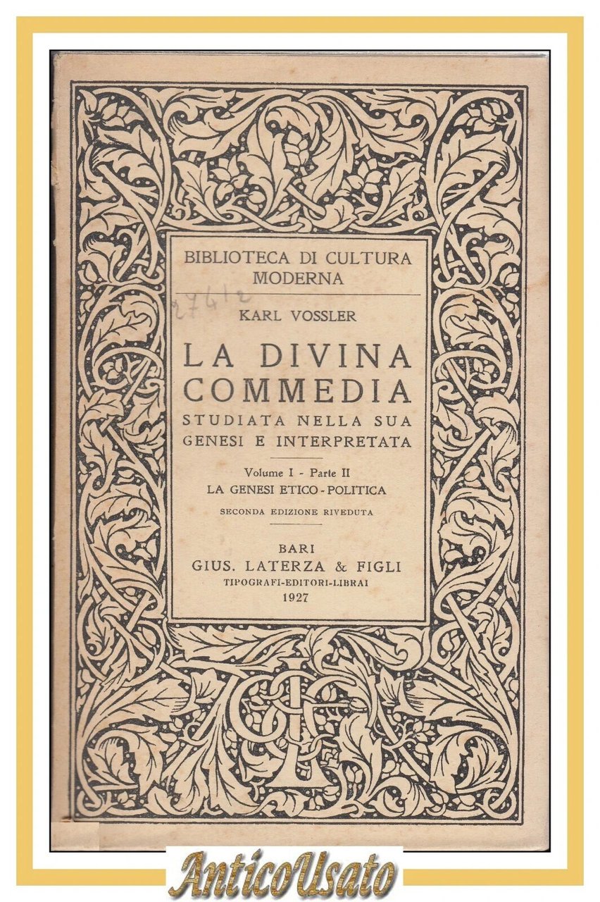 LA DIVINA COMMEDIA volume I parte 1 e 2 genesi religiosa etico di Vossler Libro