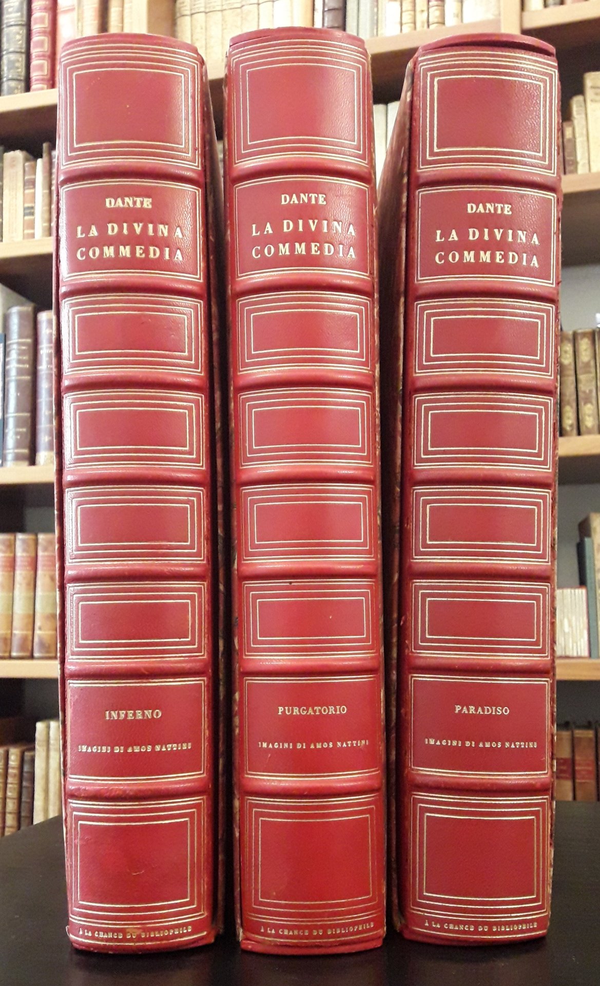 3 volumi. In 4° (cm 35x26). Pag. 442(2), (34 tavole a colori); 433(3), (33 tavole a colori); 467(5), (33 tavole a colori). Le 100 tavole sono di Amos Nattini. Edizione di 999 esemplari. Legatura in tutta pelle. Titoli e fregi in oro e nervature al dorso. Cofanetti. Tracce d'uso alle cerniere.