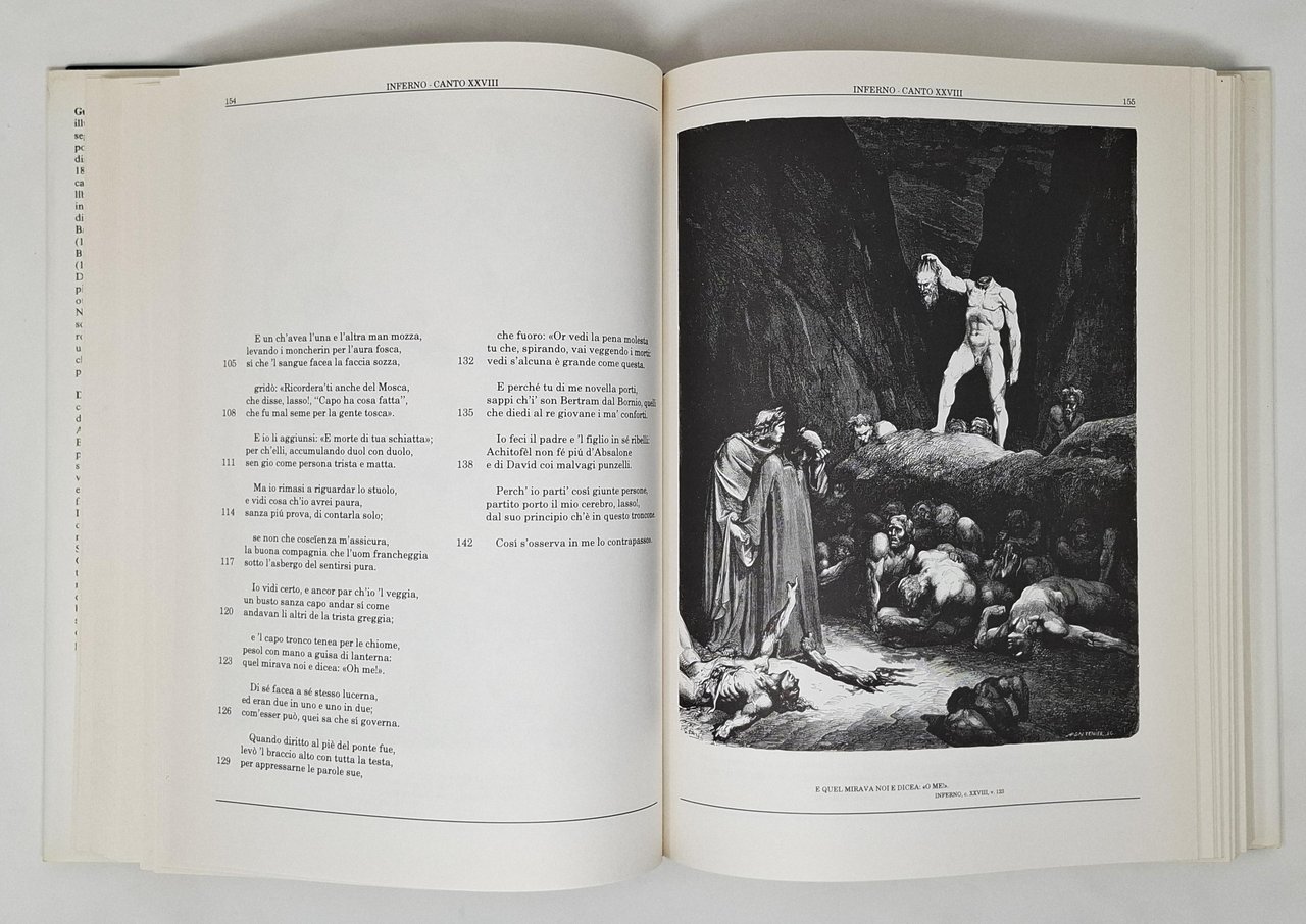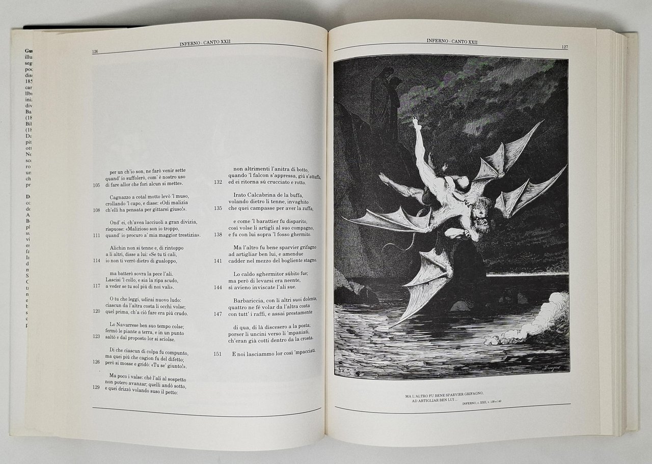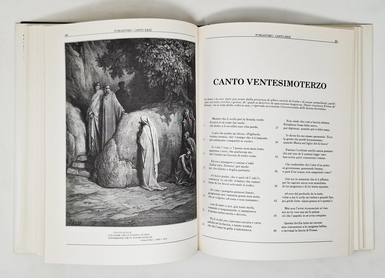 Testo integrale con 136 illustrazioni di Gustavo Doré. La presente edizione riproduce il testo critico stabilito da Giorgio Petrocchi per l'edizione nazionale della Società Dantesca Italiana. Pagine: 464. Formato: 24 x 33 cm circa. Ottimo esemplare, pari al nuovo. Copertina editoriale, cartonata rigida blu, con titoli in oro sul dorso e sovraccoperta illustrata. Sono presenti Inferno, Purgatorio e Paradiso.