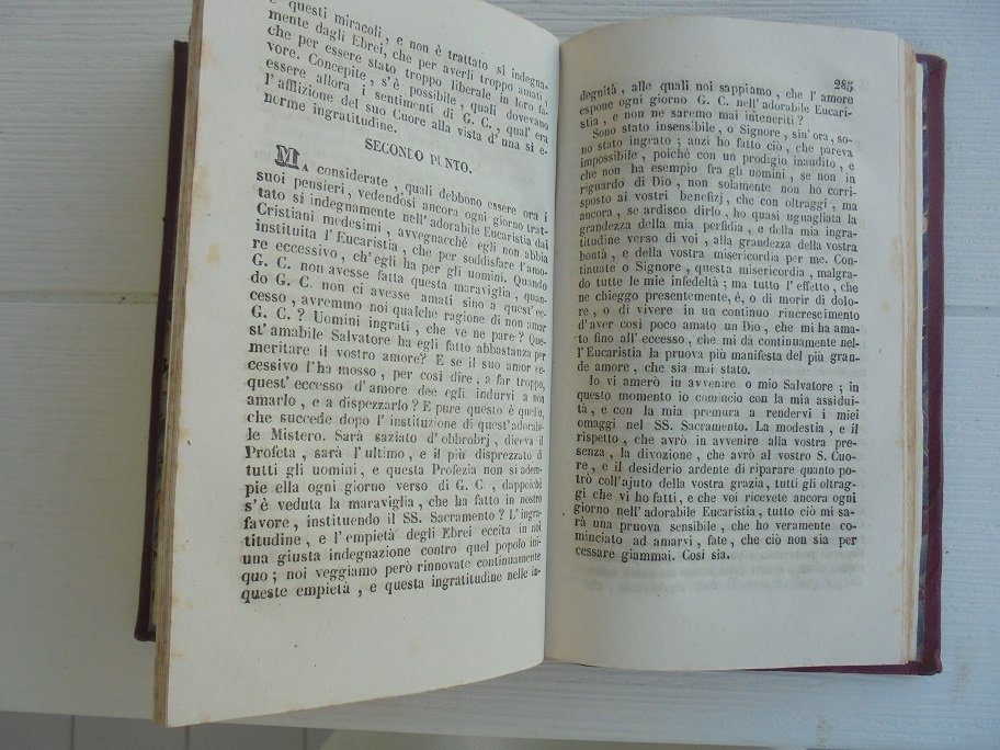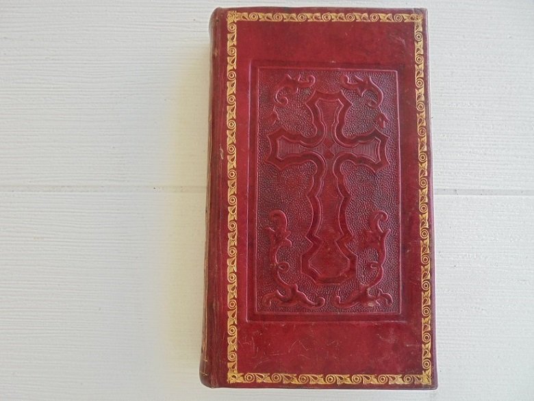 NAPOLI, DE SIMONE, 1847. In 16∞: pp. 430. Con graziosa incisione all`antiporta. Bella legatura rossa in cuoio con croce a secco ai piatti, racchiusa da bordura in oro, dorso riccamente decorato con fregi in oro. Tagli in oro, sguardie marmorizzate. Fioriture ma ben tenuto.