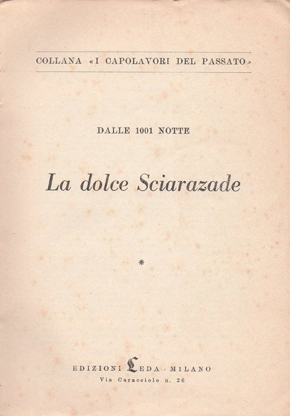 In-8°, pp. 240, copertina editoriale. Qualche traccia d'uso alla copertina e alcuni piccoli, leggeri segni d'umido al frontespizio e a qualche pagina. Per il resto, ben conservato. Indice: Storia del re Sciariar e del re Sciazaman, suo fratello; Storia del mercante e del genio; Storia del facchino e delle tre fanciulle; Storia della donna fatta a pezzi, Dei tre Pomi e del negro Rihan.