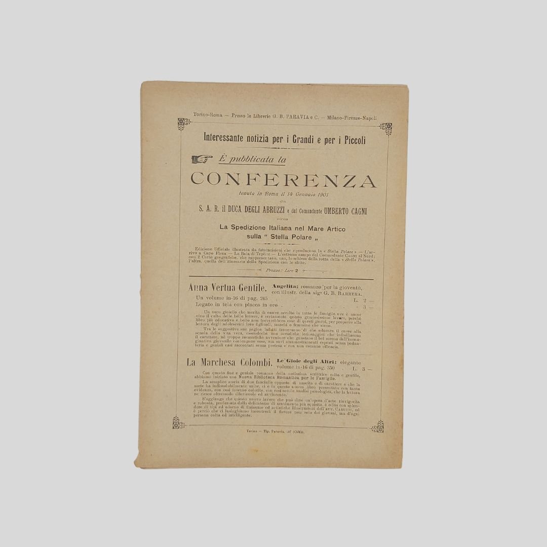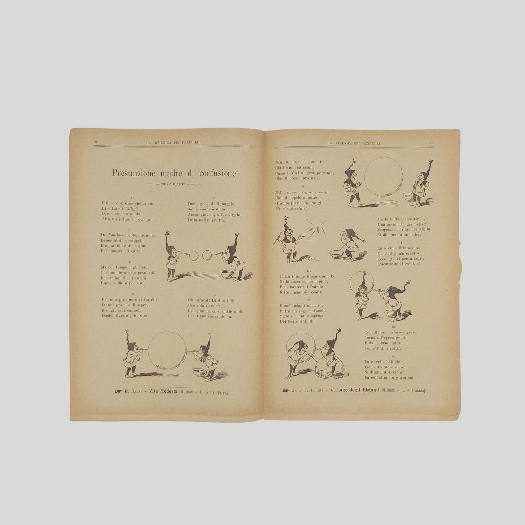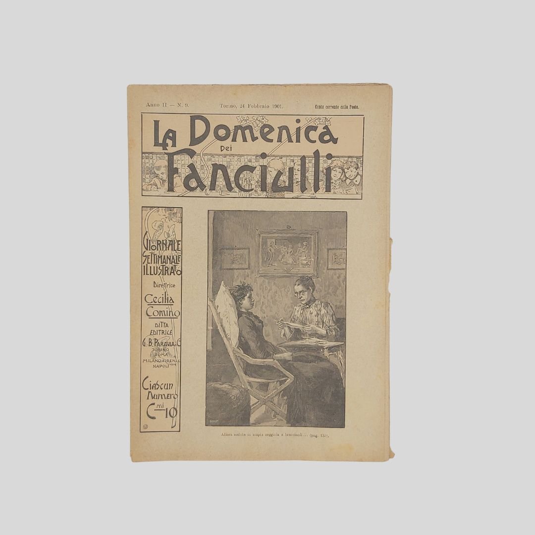 anno II, n. 9, 24 febbraio 1901, cm 27×19, pp. 16 (numeraz. continua). Dir. Cecilia Comino. Illustrazioni in bianco e nero nel testo e fuori testo e pagine di pubblicità. Testata di GIB. Cop. in bianco e nero. In buone condizioni. La domenica dei Fanciulli con la testata dalla grafica di gusto liberty e con le innovative copertine costituì uno dei più felici esempi dell’Art Nouveau. Esso dirà ai più piccoli, come ai più grandicelli, tante cosette utili a sapersi ritrarrà scene della vostra vita quotidiana in casa ed in iscuola; vi proporrà giuochi istruttivi, lavoretti geniali; vi narrerà graziose storielle; vi presenterà, come in una lanterna magica, quadri curiosi ed attraenti sui più svariati soggetti. Non comune come tutti i fascicoli del primo e secondo anno. Con l’inizio del ‘900 si vedono ridursi sempre di più le distanze tra artisti e illustratori e avviarsi una capillare diffusione delle riviste stampate con moderni procedimenti fotolitografici. È il caso del settimanale La domenica dei fanciulli, pubblicato a Torino dal 1900 al 1920, un nuovo “giornale settimanale illustrato” per bambini che andava ad affiancarsi ad altre prestigiose testate come Il Giornalino della domenica e Il Corriere dei piccoli e che proseguì le pubblicazioni per un ventennio. Edita da Paravia, fu diretta prima da Cecilia Comino e poi da Luisa Arietti. Tra i collaboratori: Teresa Corrado, T. Gironi, L. Sclaverano, E. Nuccio. Tra gli illustratori: Attilio (Attilio Mussino), Adalbert Begas, Gaido e Giulio Brugo, G. G. Bruno, F. Calmettes, Carlucci, Quinto Cenni, Gech (G. E. Chiarino), Zier (R. de La Neziére), Ch. Parc, L. Pansa.