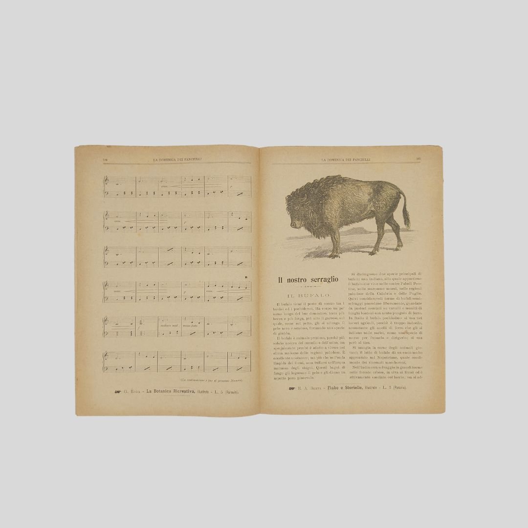 anno II, n. 7, 10 febbario 1901, cm 27×19, pp. 16 (numeraz. continua). Dir. Cecilia Comino. Illustrazioni in bianco e nero e a colori, nel testo e fuori testo e pagine di pubblicità. Da questo numero “Il nostro serraglio”, rubrica sugli animali feroci. Testata di GIB. Cop. a colori di Adalbert Begas. In buone condizioni. La domenica dei Fanciulli con la testata dalla grafica di gusto liberty e con le innovative copertine costituì uno dei più felici esempi dell’Art Nouveau. Non comune come tutti i fascicoli del primo e secondo anno. Esso dirà ai più piccoli, come ai più grandicelli, tante cosette utili a sapersi ritrarrà scene della vostra vita quotidiana in casa ed in iscuola; vi proporrà giuochi istruttivi, lavoretti geniali; vi narrerà graziose storielle; vi presenterà, come in una lanterna magica, quadri curiosi ed attraenti sui più svariati soggetti.Con l’inizio del ‘900 si vedono ridursi sempre di più le distanze tra artisti e illustratori e avviarsi una capillare diffusione delle riviste stampate con moderni procedimenti fotolitografici. È il caso del settimanale La domenica dei fanciulli, pubblicato a Torino dal 1900 al 1920, un nuovo “giornale settimanale illustrato” per bambini che andava ad affiancarsi ad altre prestigiose testate come Il Giornalino della domenica e Il Corriere dei piccoli e che proseguì le pubblicazioni per un ventennio. Edita da Paravia, fu diretta prima da Cecilia Comino e poi da Luisa Arietti. Tra i collaboratori: Teresa Corrado, T. Gironi, L. Sclaverano, E. Nuccio. Tra gli illustratori: Attilio (Attilio Mussino), Adalbert Begas, Gaido e Giulio Brugo, G. G. Bruno, F. Calmettes, Carlucci, Quinto Cenni, Gech (G. E. Chiarino), Zier (R. de La Neziére), Ch. Parc, L. Pansa.