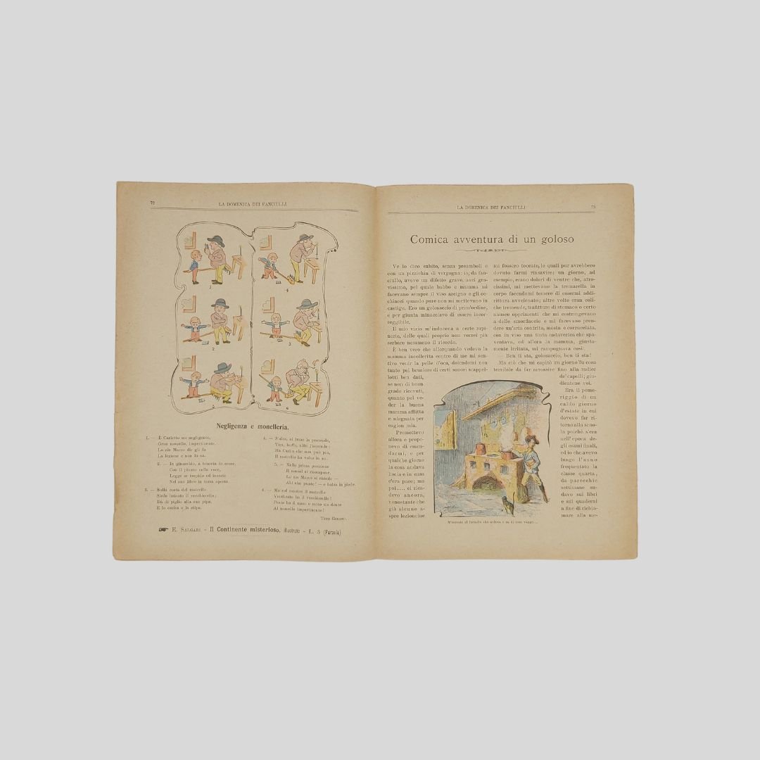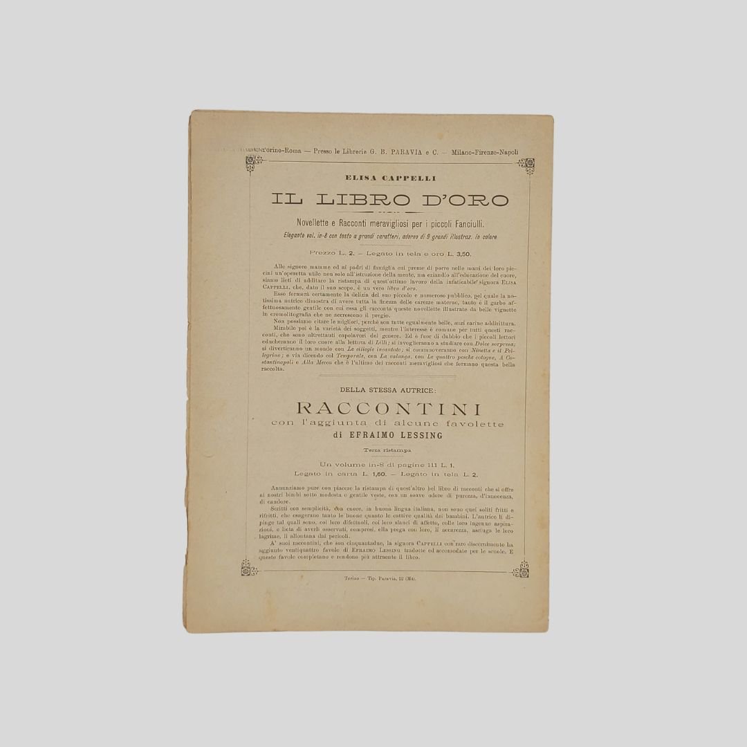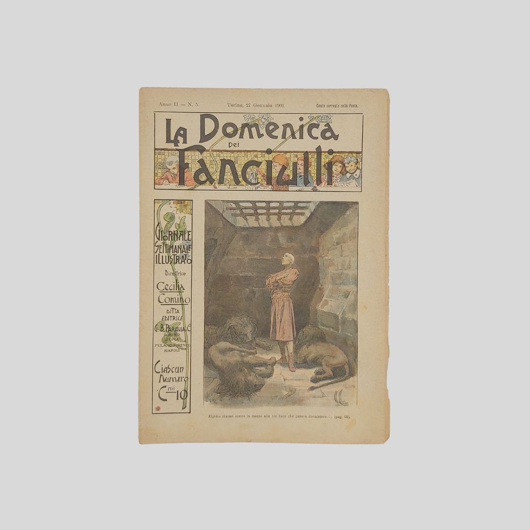 anno II, n. 5, 27 gennaio 1901, cm 27×19, pp. 16 (numeraz. continua). Dir. Cecilia Comino. Illustrazioni in bianco e nero e a colori, nel testo e fuori testo e pagine di pubblicità. Testata di GIB. Cop. a colori di Zier. In buone condizioni. La domenica dei Fanciulli con la testata dalla grafica di gusto liberty e con le innovative copertine costituì uno dei più felici esempi dell’Art Nouveau. Non comune come tutti i fascicoli del primo e secondo anno. Non comune come tutti i fascicoli del primo e secondo anno. La domenica dei Fanciulli con la testata dalla grafica di gusto liberty e con le innovative copertine costituì uno dei più felici esempi dell’Art Nouveau<BR>Esso dirà ai più piccoli, come ai più grandicelli, tante cosette utili a sapersi ritrarrà scene della vostra vita quotidiana in casa ed in iscuola; vi proporrà giuochi istruttivi, lavoretti geniali; vi narrerà graziose storielle; vi presenterà, come in una lanterna magica, quadri curiosi ed attraenti sui più svariati soggetti.Con l’inizio del ‘900 si vedono ridursi sempre di più le distanze tra artisti e illustratori e avviarsi una capillare diffusione delle riviste stampate con moderni procedimenti fotolitografici. È il caso del settimanale La domenica dei fanciulli, pubblicato a Torino dal 1900 al 1920, un nuovo “giornale settimanale illustrato” per bambini che andava ad affiancarsi ad altre prestigiose testate come Il Giornalino della domenica e Il Corriere dei piccoli e che proseguì le pubblicazioni per un ventennio. Edita da Paravia, fu diretta prima da Cecilia Comino e poi da Luisa Arietti. Tra i collaboratori: Teresa Corrado, T. Gironi, L. Sclaverano, E. Nuccio. Tra gli illustratori: Attilio (Attilio Mussino), Adalbert Begas, Gaido e Giulio Brugo, G. G. Bruno, F. Calmettes, Carlucci, Quinto Cenni, Gech (G. E. Chiarino), Zier (R. de La Neziére), Ch. Parc, L. Pansa.