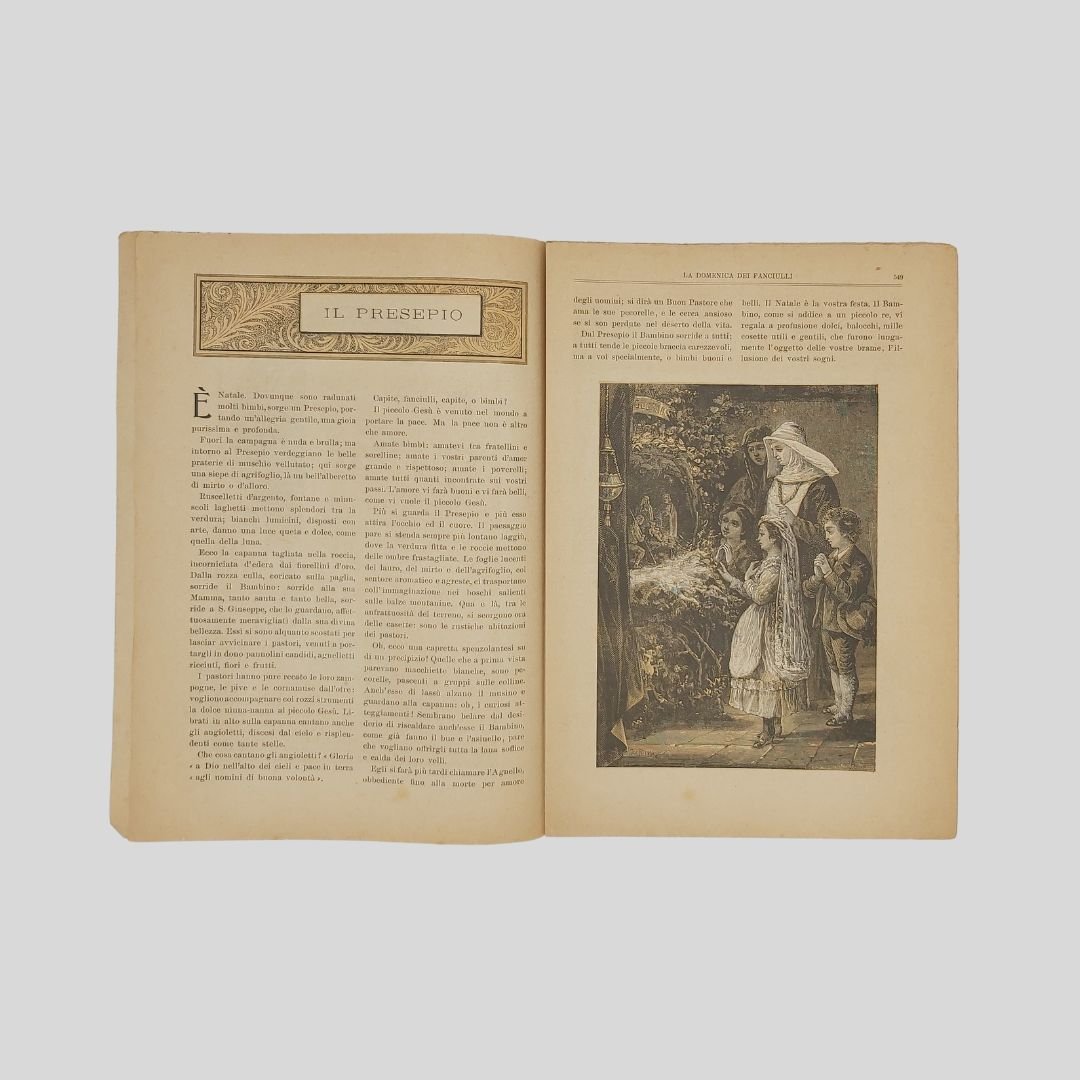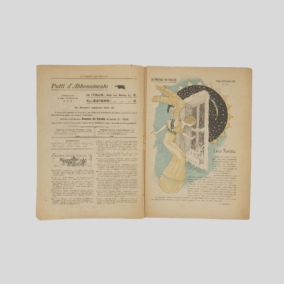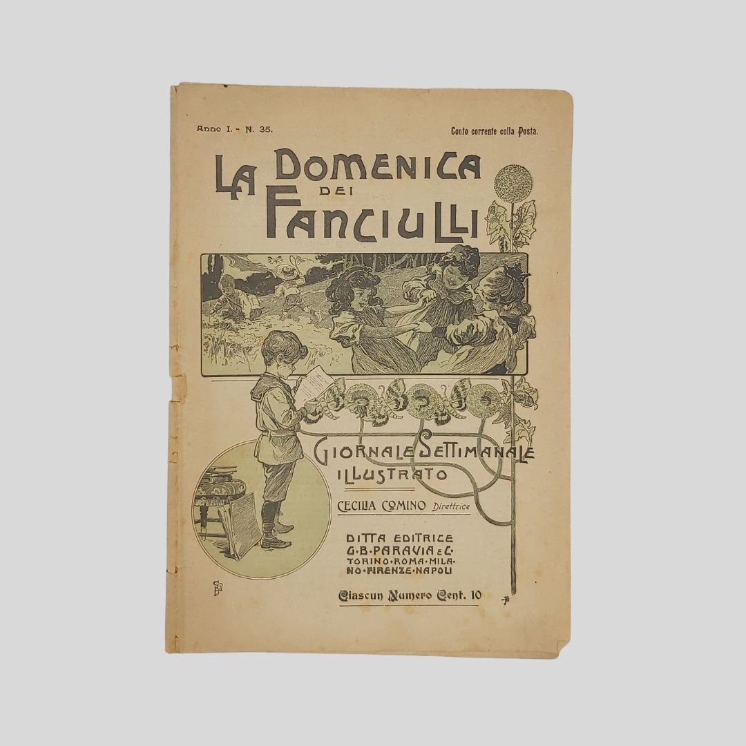 anno I, n. 35, 23 dicembre 1900, cm 27×19, pp. 16 (numeraz. continua). Dir. Cecilia Comino. Illustrazioni in bianco e nero e a colori, nel testo e fuori testo e pagine di pubblicità. Cop. a colori.dedicata al Natale (letterina). All’interno bella illustrazione liberty a colori di Gech. Tra i racconti: Il Presepio di Cecilia Comino. Lievi tracce d’uso. Raro. La domenica dei Fanciulli con la testata dalla grafica di gusto liberty e con le innovative copertine costituì uno dei più felici esempi dell’Art Nouveau. Esso dirà ai più piccoli, come ai più grandicelli, tante cosette utili a sapersi ritrarrà scene della vostra vita quotidiana in casa ed in iscuola; vi proporrà giuochi istruttivi, lavoretti geniali; vi narrerà graziose storielle; vi presenterà, come in una lanterna magica, quadri curiosi ed attraenti sui più svariati soggetti.Con l’inizio del ‘900 si vedono ridursi sempre di più le distanze tra artisti e illustratori e avviarsi una capillare diffusione delle riviste stampate con moderni procedimenti fotolitografici. È il caso del settimanale La domenica dei fanciulli, pubblicato a Torino dal 1900 al 1920, un nuovo “giornale settimanale illustrato” per bambini che andava ad affiancarsi ad altre prestigiose testate come Il Giornalino della domenica e Il Corriere dei piccoli e che proseguì le pubblicazioni per un ventennio. Edita da Paravia, fu diretta prima da Cecilia Comino e poi da Luisa Arietti. Tra i collaboratori: Teresa Corrado, T. Gironi, L. Sclaverano, E. Nuccio. Tra gli illustratori: Attilio (Attilio Mussino), Adalbert Begas, Gaido e Giulio Brugo, G. G. Bruno, F. Calmettes, Carlucci, Quinto Cenni, Gech (G. E. Chiarino), Zier (R. de La Neziére), Ch. Parc, L. Pansa.