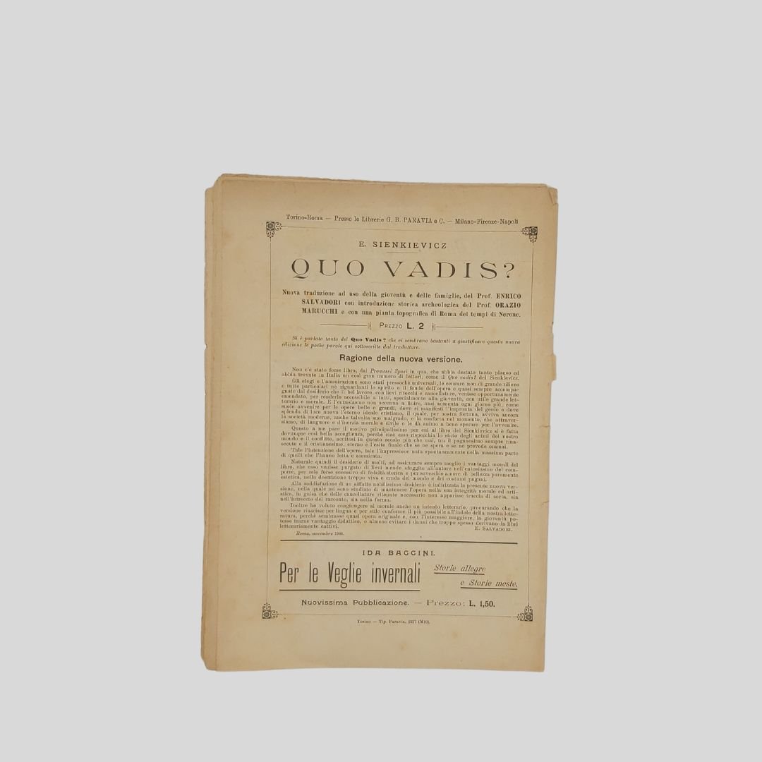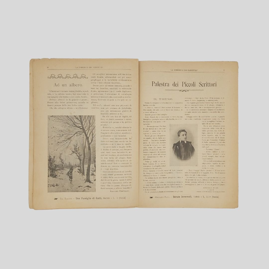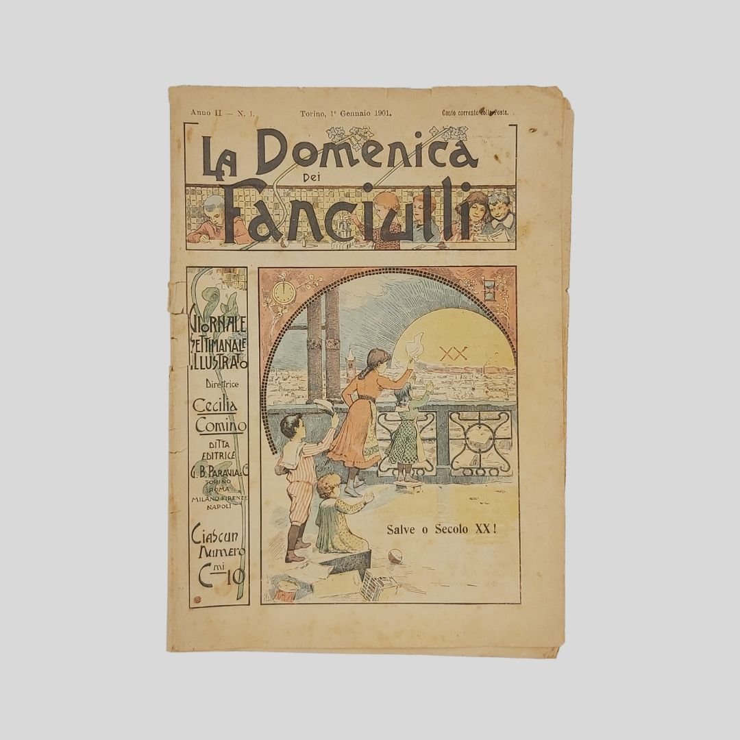 anno II, n.1, 1 gennaio 1901, cm 27×19, pp. 16. Dir. Cecilia Comino. Copertina dedicata all’alba del nuovo secolo: «Salve o Secolo XX!». Illustrazioni in bianco e nero e a colori, nel testo e fuori testo e pagine di pubblicità. Testata di GIB. Cop. a colori. Lievi tracce d’uso. Non comune come tutti i fascicoli del primo e secondo anno. La domenica dei Fanciulli con la testata dalla grafica di gusto liberty e con le innovative copertine costituì uno dei più felici esempi dell’Art Nouveau<BR>Esso dirà ai più piccoli, come ai più grandicelli, tante cosette utili a sapersi ritrarrà scene della vostra vita quotidiana in casa ed in iscuola; vi proporrà giuochi istruttivi, lavoretti geniali; vi narrerà graziose storielle; vi presenterà, come in una lanterna magica, quadri curiosi ed attraenti sui più svariati soggetti.Con l’inizio del ‘900 si vedono ridursi sempre di più le distanze tra artisti e illustratori e avviarsi una capillare diffusione delle riviste stampate con moderni procedimenti fotolitografici. È il caso del settimanale La domenica dei fanciulli, pubblicato a Torino dal 1900 al 1920, un nuovo “giornale settimanale illustrato” per bambini che andava ad affiancarsi ad altre prestigiose testate come Il Giornalino della domenica e Il Corriere dei piccoli e che proseguì le pubblicazioni per un ventennio. Edita da Paravia, fu diretta prima da Cecilia Comino e poi da Luisa Arietti. Tra i collaboratori: Teresa Corrado, T. Gironi, L. Sclaverano, E. Nuccio. Attilio (Attilio Mussino), Adalbert Begas, Gaido e Giulio Brugo, G. G. Bruno, F. Calmettes, Carlucci, Quinto Cenni, Gech (G. E. Chiarino), Zier (R. de La Neziére), Ch. Parc, L. Pansa.