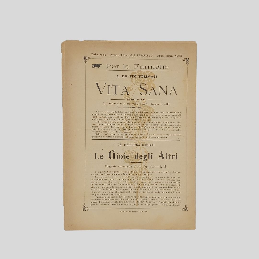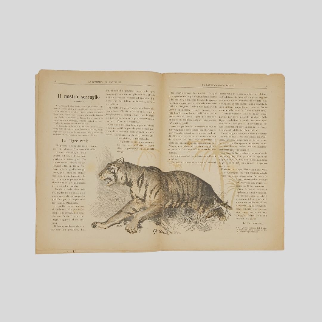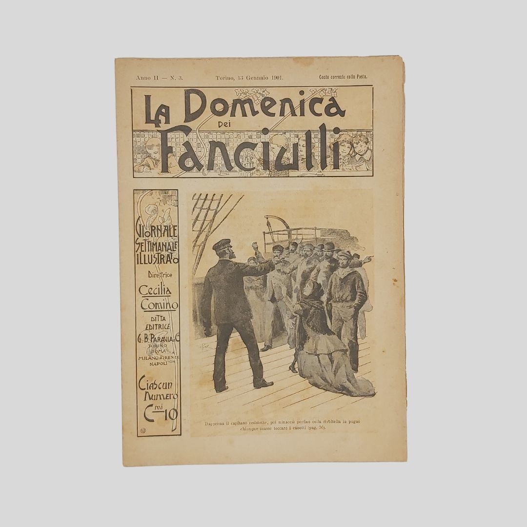 anno II, n. 3, 13 gennaio 1901, cm 27×19, pp. 16 (numeraz. continua). Dir. Cecilia Comino. Illustrazioni in bianco e nero e a colori, nel testo e fuori testo e pagine di pubblicità. Da questo numero “Il nostro serraglio”, rubrica sugli animali feroci con illustrazione a colori di Q. Cenni. Testata di GIB. Cop. a colori di Ch. Parc. In buone condizioni. Non comune come tutti i fascicoli del primo e secondo anno. La domenica dei Fanciulli con la testata dalla grafica di gusto liberty e con le innovative copertine costituì uno dei più felici esempi dell’Art Nouveau. La domenica dei Fanciulli con la testata dalla grafica di gusto liberty e con le innovative copertine costituì uno dei più felici esempi dell’Art Nouveau<BR>Esso dirà ai più piccoli, come ai più grandicelli, tante cosette utili a sapersi ritrarrà scene della vostra vita quotidiana in casa ed in iscuola; vi proporrà giuochi istruttivi, lavoretti geniali; vi narrerà graziose storielle; vi presenterà, come in una lanterna magica, quadri curiosi ed attraenti sui più svariati soggetti.<BR><BR>Con l’inizio del ‘900 si vedono ridursi sempre di più le distanze tra artisti e illustratori e avviarsi una capillare diffusione delle riviste stampate con moderni procedimenti fotolitografici. È il caso del settimanale La domenica dei fanciulli, pubblicato a Torino dal 1900 al 1920, un nuovo “giornale settimanale illustrato” per bambini che andava ad affiancarsi ad altre prestigiose testate come Il Giornalino della domenica e Il Corriere dei piccoli e che proseguì le pubblicazioni per un ventennio. Edita da Paravia, fu diretta prima da Cecilia Comino e poi da Luisa Arietti. Tra i collaboratori: Teresa Corrado, T. Gironi, L. Sclaverano, E. Nuccio. Tra gli illustratori: Attilio (Attilio Mussino), Adalbert Begas, Gaido e Giulio Brugo, G. G. Bruno, F. Calmettes, Carlucci, Quinto Cenni, Gech (G. E. Chiarino), Zier (R. de La Neziére), Ch. Parc, L. Pansa.