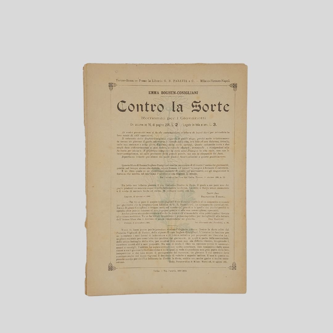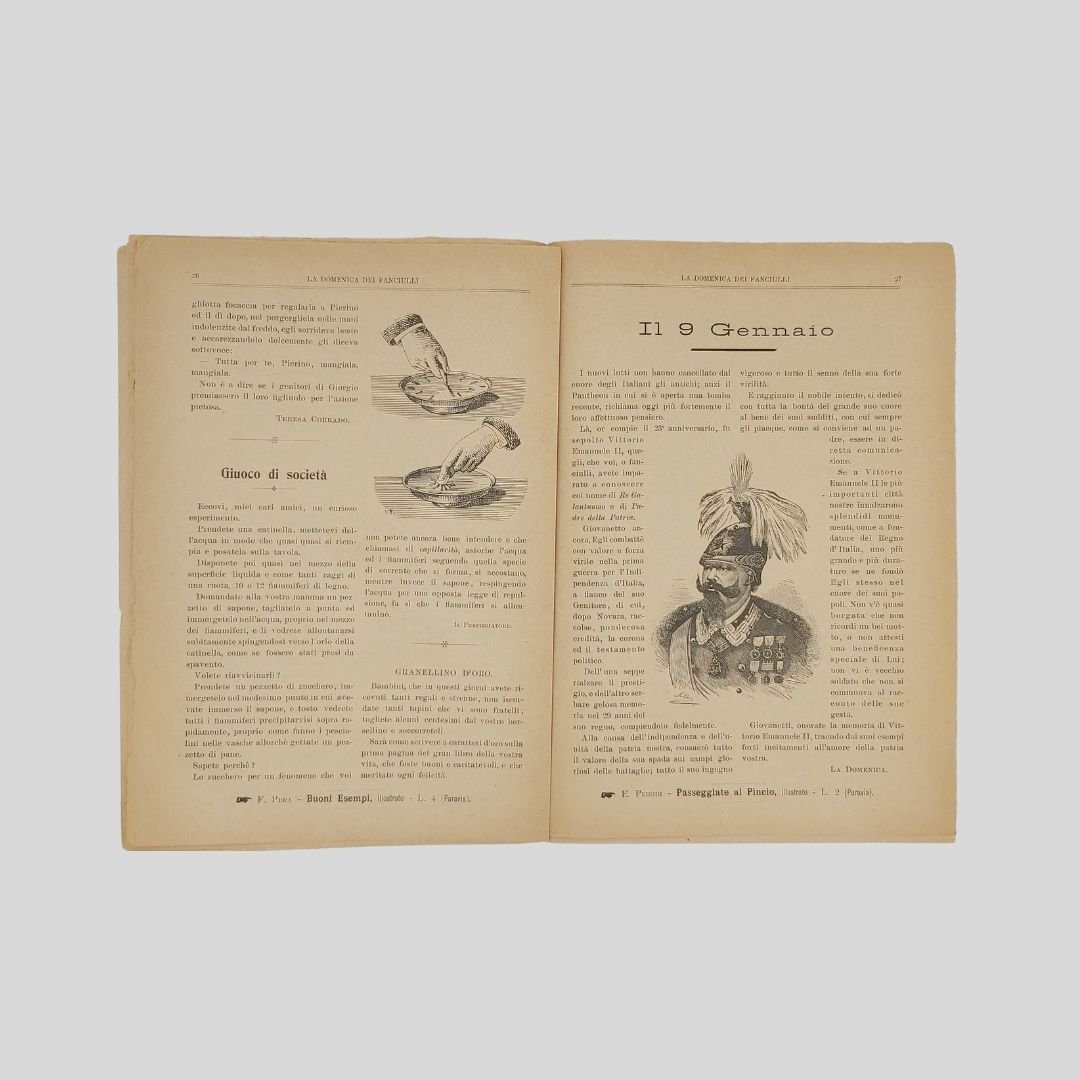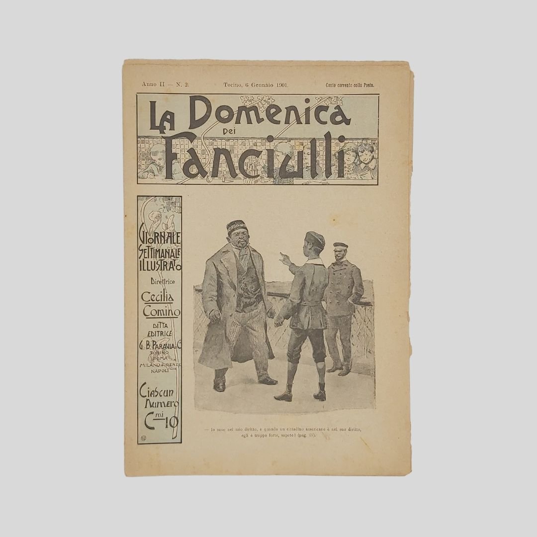 anno II, n. 2, 6 gennaio 1901, cm 27×19, pp. 16 (numeraz. continua). Dir. Cecilia Comino. Illustrazioni in bianco e nero e a colori, nel testo e fuori testo e pagine di pubblicità. Testata di GIB. Cop. a colori. In buone condizioni. Non comune come tutti i fascicoli del primo e secondo anno. La domenica dei Fanciulli con la testata dalla grafica di gusto liberty e con le innovative copertine costituì uno dei più felici esempi dell’Art Nouveau<BR>Esso dirà ai più piccoli, come ai più grandicelli, tante cosette utili a sapersi ritrarrà scene della vostra vita quotidiana in casa ed in iscuola; vi proporrà giuochi istruttivi, lavoretti geniali; vi narrerà graziose storielle; vi presenterà, come in una lanterna magica, quadri curiosi ed attraenti sui più svariati soggetti.Con l’inizio del ‘900 si vedono ridursi sempre di più le distanze tra artisti e illustratori e avviarsi una capillare diffusione delle riviste stampate con moderni procedimenti fotolitografici. È il caso del settimanale La domenica dei fanciulli, pubblicato a Torino dal 1900 al 1920, un nuovo “giornale settimanale illustrato” per bambini che andava ad affiancarsi ad altre prestigiose testate come Il Giornalino della domenica e Il Corriere dei piccoli e che proseguì le pubblicazioni per un ventennio. Edita da Paravia, fu diretta prima da Cecilia Comino e poi da Luisa Arietti. Tra i collaboratori: Teresa Corrado, T. Gironi, L. Sclaverano, E. Nuccio. Tra gli illustratori: Attilio (Attilio Mussino), Adalbert Begas, Gaido e Giulio Brugo, G. G. Bruno, F. Calmettes, Carlucci, Quinto Cenni, Gech (G. E. Chiarino), Zier (R. de La Neziére), Ch. Parc, L. Pansa.