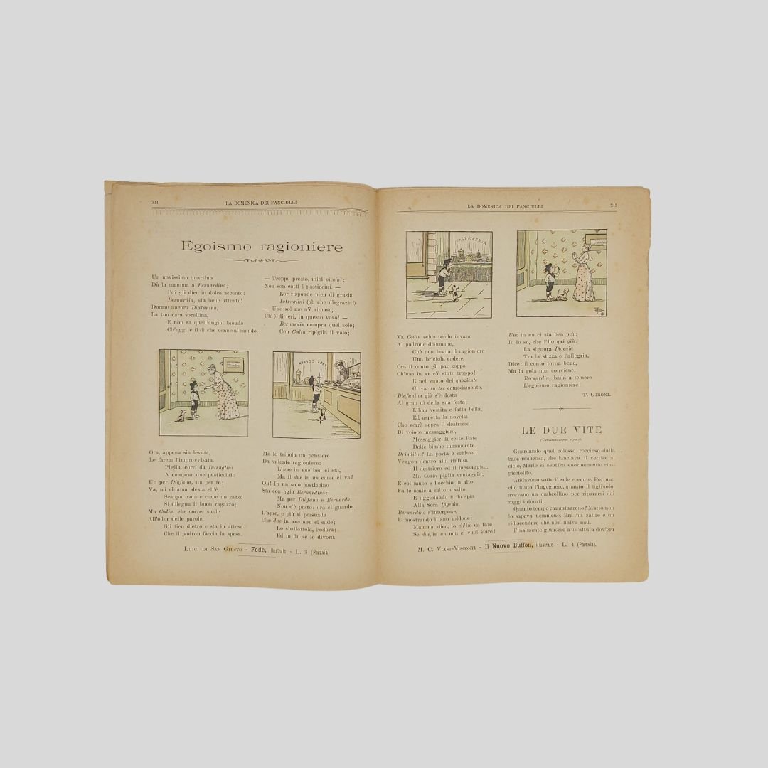 anno II, n. 22, 26 maggio 1901, cm 27×19, pp. 16 (numeraz. continua). Dir. Cecilia Comino. Illustrazioni in bianco e nero e a colori, nel testo e fuori testo e pagine di pubblicità. Testata di GIB. Cop. a colori di Gech. Lievi fioriture alle cop. Non comune come tutti i fascicoli del primo e secondo anno. La domenica dei Fanciulli con la testata dalla grafica di gusto liberty e con le innovative copertine costituì uno dei più felici esempi dell’Art Nouveau. Esso dirà ai più piccoli, come ai più grandicelli, tante cosette utili a sapersi ritrarrà scene della vostra vita quotidiana in casa ed in iscuola; vi proporrà giuochi istruttivi, lavoretti geniali; vi narrerà graziose storielle; vi presenterà, come in una lanterna magica, quadri curiosi ed attraenti sui più svariati soggetti. Con l’inizio del ‘900 si vedono ridursi sempre di più le distanze tra artisti e illustratori e avviarsi una capillare diffusione delle riviste stampate con moderni procedimenti fotolitografici. È il caso del settimanale La domenica dei fanciulli, pubblicato a Torino dal 1900 al 1920, un nuovo “giornale settimanale illustrato” per bambini che andava ad affiancarsi ad altre prestigiose testate come Il Giornalino della domenica e Il Corriere dei piccoli e che proseguì le pubblicazioni per un ventennio. Edita da Paravia, fu diretta prima da Cecilia Comino e poi da Luisa Arietti. Tra i collaboratori: Teresa Corrado, T. Gironi, L. Sclaverano, E. Nuccio. Tra gli illustratori: Attilio (Attilio Mussino), Adalbert Begas, Gaido e Giulio Brugo, G. G. Bruno, F. Calmettes, Carlucci, Quinto Cenni, Gech (G. E. Chiarino), Zier (R. de La Neziére), Ch. Parc, L. Pansa.