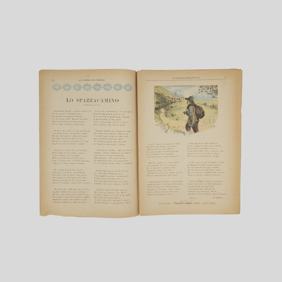 anno II, n. 45, 3 novembre 1901, cm 27×19, pp. 16 (numeraz. continua). Dir. Cecilia Comino. Illustrazioni in bianco e nero e a colori, nel testo e fuori testo e pagine di pubblicità. Testata di GIB. Cop. a colori di Gech. Piccolo strappo al margine inferiore senza perdita del testo, ma in buone condizioni. Non comune come tutti i fascicoli del primo e secondo anno. La domenica dei Fanciulli con la testata dalla grafica di gusto liberty e con le innovative copertine costituì uno dei più felici esempi dell’Art Nouveau. Esso dirà ai più piccoli, come ai più grandicelli, tante cosette utili a sapersi ritrarrà scene della vostra vita quotidiana in casa ed in iscuola; vi proporrà giuochi istruttivi, lavoretti geniali; vi narrerà graziose storielle; vi presenterà, come in una lanterna magica, quadri curiosi ed attraenti sui più svariati soggetti. Con l’inizio del ‘900 si vedono ridursi sempre di più le distanze tra artisti e illustratori e avviarsi una capillare diffusione delle riviste stampate con moderni procedimenti fotolitografici. È il caso del settimanale La domenica dei fanciulli, pubblicato a Torino dal 1900 al 1920, un nuovo “giornale settimanale illustrato” per bambini che andava ad affiancarsi ad altre prestigiose testate come Il Giornalino della domenica e Il Corriere dei piccoli e che proseguì le pubblicazioni per un ventennio. Edita da Paravia, fu diretta prima da Cecilia Comino e poi da Luisa Arietti. Tra i collaboratori: Teresa Corrado, T. Gironi, L. Sclaverano, E. Nuccio. Tra gli illustratori: Attilio (Attilio Mussino), Adalbert Begas, Gaido e Giulio Brugo, G. G. Bruno, F. Calmettes, Carlucci, Quinto Cenni, Gech (G. E. Chiarino), Zier (R. de La Neziére), Ch. Parc, L. Pansa.
