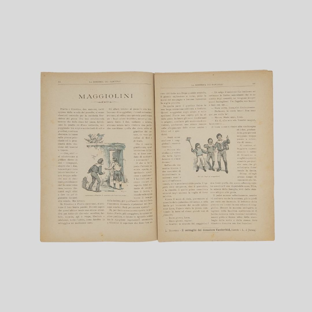 anno II, n. 21, 19 maggio 1901, cm 27×19, pp. 16 (numeraz. continua). Dir. Cecilia Comino. Illustrazioni in bianco e nero e a colori, nel testo e fuori testo e pagine di pubblicità. Testata di GIB. Cop. a colori. In buone condizioni. Non comune come tutti i fascicoli del primo e secondo anno. La domenica dei Fanciulli con la testata dalla grafica di gusto liberty e con le innovative copertine costituì uno dei più felici esempi dell’Art Nouveau. Esso dirà ai più piccoli, come ai più grandicelli, tante cosette utili a sapersi ritrarrà scene della vostra vita quotidiana in casa ed in iscuola; vi proporrà giuochi istruttivi, lavoretti geniali; vi narrerà graziose storielle; vi presenterà, come in una lanterna magica, quadri curiosi ed attraenti sui più svariati soggetti. Con l’inizio del ‘900 si vedono ridursi sempre di più le distanze tra artisti e illustratori e avviarsi una capillare diffusione delle riviste stampate con moderni procedimenti fotolitografici. È il caso del settimanale La domenica dei fanciulli, pubblicato a Torino dal 1900 al 1920, un nuovo “giornale settimanale illustrato” per bambini che andava ad affiancarsi ad altre prestigiose testate come Il Giornalino della domenica e Il Corriere dei piccoli e che proseguì le pubblicazioni per un ventennio. Edita da Paravia, fu diretta prima da Cecilia Comino e poi da Luisa Arietti. Tra i collaboratori: Teresa Corrado, T. Gironi, L. Sclaverano, E. Nuccio. Tra gli illustratori: Attilio (Attilio Mussino), Adalbert Begas, Gaido e Giulio Brugo, G. G. Bruno, F. Calmettes, Carlucci, Quinto Cenni, Gech (G. E. Chiarino), Zier (R. de La Neziére), Ch. Parc, L. Pansa.