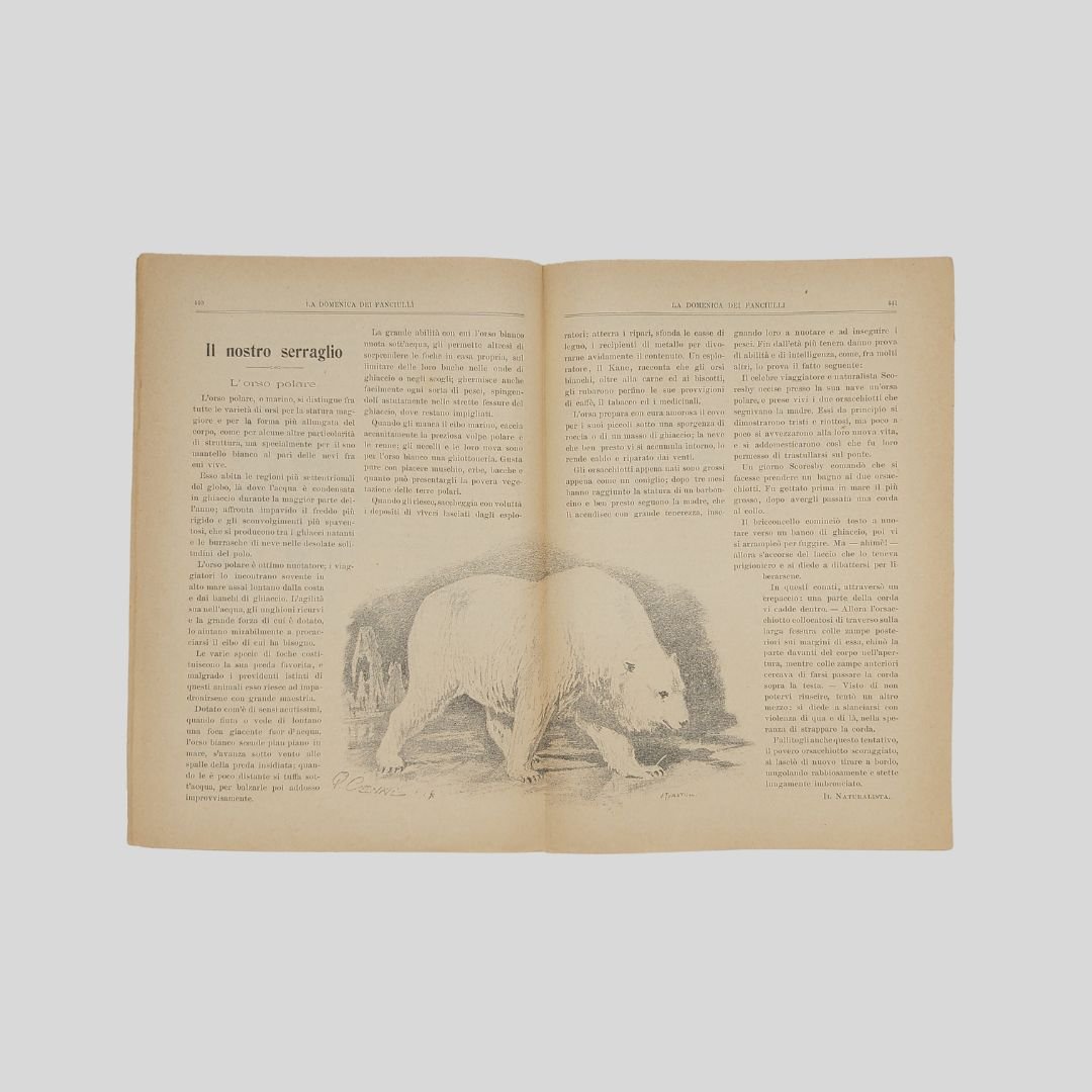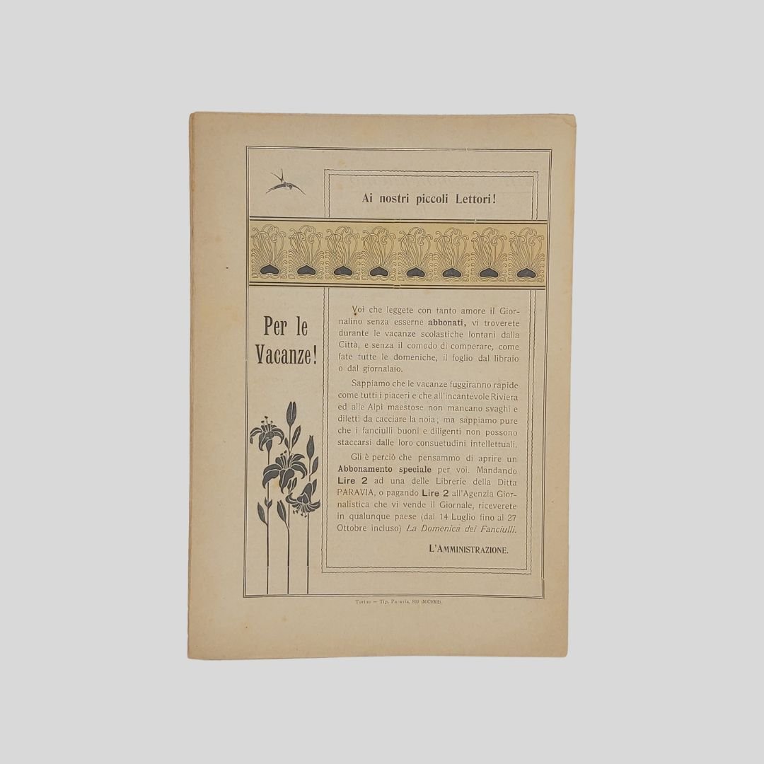 anno II, n. 28, 7 luglio 1901, cm 27×19, pp. 16 (numeraz. continua). Dir. Cecilia Comino. Illustrazioni in bianco e nero e a colori, nel testo e fuori testo e pagine di pubblicità. Da questo numero “Il nostro serraglio”, rubrica sugli animali feroci con illustrazione in bianco e nero di Q. Cenni. Testata di GIB. Cop. a colori. In buone condizioni. Non comune come tutti i fascicoli del primo e secondo anno. La domenica dei Fanciulli con la testata dalla grafica di gusto liberty e con le innovative copertine costituì uno dei più felici esempi dell’Art Nouveau. Esso dirà ai più piccoli, come ai più grandicelli, tante cosette utili a sapersi ritrarrà scene della vostra vita quotidiana in casa ed in iscuola; vi proporrà giuochi istruttivi, lavoretti geniali; vi narrerà graziose storielle; vi presenterà, come in una lanterna magica, quadri curiosi ed attraenti sui più svariati soggetti. Con l’inizio del ‘900 si vedono ridursi sempre di più le distanze tra artisti e illustratori e avviarsi una capillare diffusione delle riviste stampate con moderni procedimenti fotolitografici. È il caso del settimanale La domenica dei fanciulli, pubblicato a Torino dal 1900 al 1920, un nuovo “giornale settimanale illustrato” per bambini che andava ad affiancarsi ad altre prestigiose testate come Il Giornalino della domenica e Il Corriere dei piccoli e che proseguì le pubblicazioni per un ventennio. Edita da Paravia, fu diretta prima da Cecilia Comino e poi da Luisa Arietti. Tra i collaboratori: Teresa Corrado, T. Gironi, L. Sclaverano, E. Nuccio. Tra gli illustratori: Attilio (Attilio Mussino), Adalbert Begas, Gaido e Giulio Brugo, G. G. Bruno, F. Calmettes, Carlucci, Quinto Cenni, Gech (G. E. Chiarino), Zier (R. de La Neziére), Ch. Parc, L. Pansa.