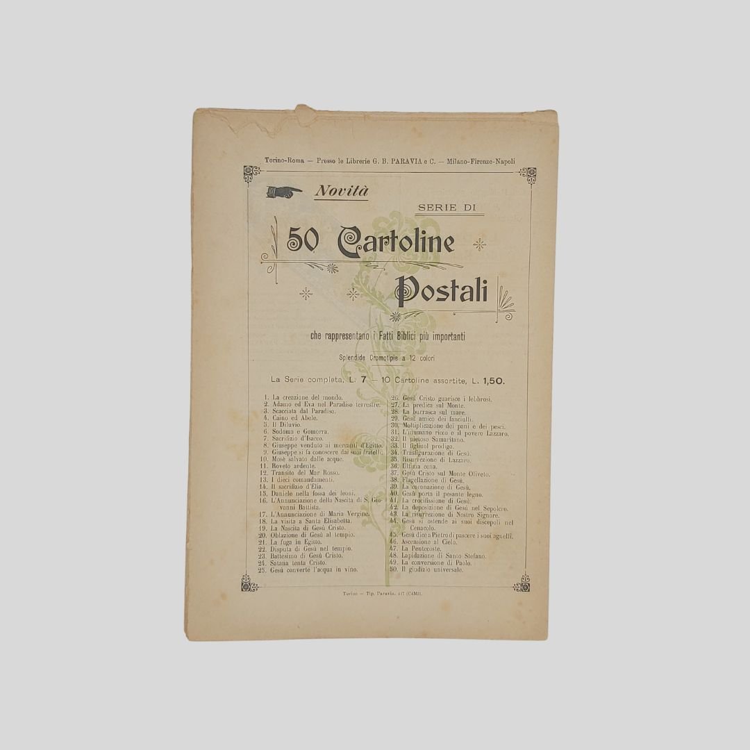 anno II, n. 17, 21 aprile 1901, cm 27×19, pp. 16 (numeraz. continua). Dir. Cecilia Comino. Illustrazioni in bianco e nero e a colori, nel testo e fuori testo e pagine di pubblicità. Testata di GIB. Cop. in bianco e nero. Lievi fioriture alla cop. Non comune come tutti i fascicoli del primo e secondo anno. La domenica dei Fanciulli con la testata dalla grafica di gusto liberty e con le innovative copertine costituì uno dei più felici esempi dell’Art Nouveau. Esso dirà ai più piccoli, come ai più grandicelli, tante cosette utili a sapersi ritrarrà scene della vostra vita quotidiana in casa ed in iscuola; vi proporrà giuochi istruttivi, lavoretti geniali; vi narrerà graziose storielle; vi presenterà, come in una lanterna magica, quadri curiosi ed attraenti sui più svariati soggetti. on l’inizio del ‘900 si vedono ridursi sempre di più le distanze tra artisti e illustratori e avviarsi una capillare diffusione delle riviste stampate con moderni procedimenti fotolitografici. È il caso del settimanale La domenica dei fanciulli, pubblicato a Torino dal 1900 al 1920, un nuovo “giornale settimanale illustrato” per bambini che andava ad affiancarsi ad altre prestigiose testate come Il Giornalino della domenica e Il Corriere dei piccoli e che proseguì le pubblicazioni per un ventennio. Edita da Paravia, fu diretta prima da Cecilia Comino e poi da Luisa Arietti. Tra i collaboratori: Teresa Corrado, T. Gironi, L. Sclaverano, E. Nuccio. Tra gli illustratori: Attilio (Attilio Mussino), Adalbert Begas, Gaido e Giulio Brugo, G. G. Bruno, F. Calmettes, Carlucci, Quinto Cenni, Gech (G. E. Chiarino), Zier (R. de La Neziére), Ch. Parc, L. Pansa.