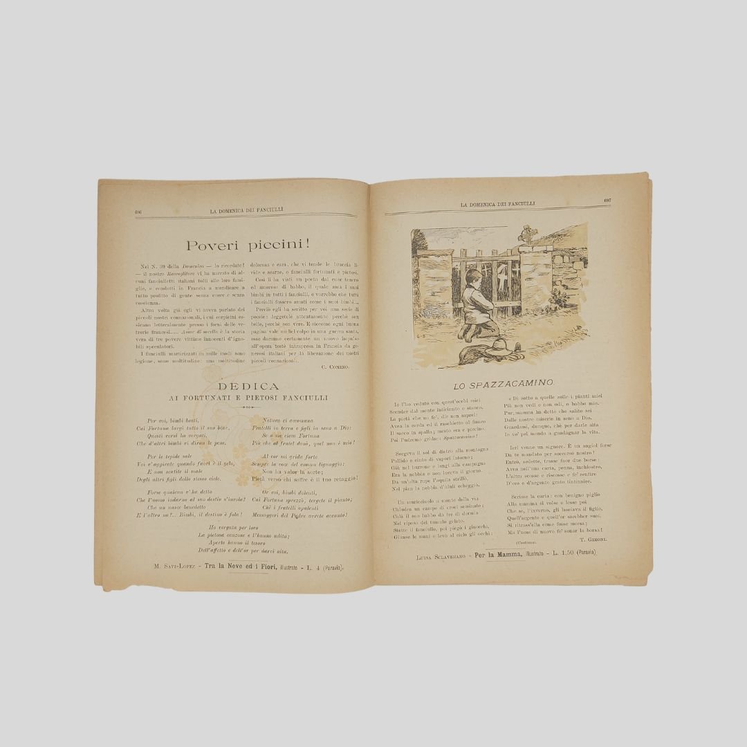 anno II, n. 44, 27 ottobre 1901, cm 27×19, pp. 16 (numeraz. continua). Dir. Cecilia Comino. Illustrazioni in bianco e nero e a colori, nel testo e fuori testo e pagine di pubblicità. Testata di GIB. Cop. a colori di Gech. Lievi fioriture alla cop. Non comune come tutti i fascicoli del primo e secondo anno. Non comune come tutti i fascicoli del primo e secondo anno. La domenica dei Fanciulli con la testata dalla grafica di gusto liberty e con le innovative copertine costituì uno dei più felici esempi dell’Art Nouveau. Esso dirà ai più piccoli, come ai più grandicelli, tante cosette utili a sapersi ritrarrà scene della vostra vita quotidiana in casa ed in iscuola; vi proporrà giuochi istruttivi, lavoretti geniali; vi narrerà graziose storielle; vi presenterà, come in una lanterna magica, quadri curiosi ed attraenti sui più svariati soggetti. Con l’inizio del ‘900 si vedono ridursi sempre di più le distanze tra artisti e illustratori e avviarsi una capillare diffusione delle riviste stampate con moderni procedimenti fotolitografici. È il caso del settimanale La domenica dei fanciulli, pubblicato a Torino dal 1900 al 1920, un nuovo “giornale settimanale illustrato” per bambini che andava ad affiancarsi ad altre prestigiose testate come Il Giornalino della domenica e Il Corriere dei piccoli e che proseguì le pubblicazioni per un ventennio. Edita da Paravia, fu diretta prima da Cecilia Comino e poi da Luisa Arietti. Tra i collaboratori: Teresa Corrado, T. Gironi, L. Sclaverano, E. Nuccio. Tra gli illustratori: Attilio (Attilio Mussino), Adalbert Begas, Gaido e Giulio Brugo, G. G. Bruno, F. Calmettes, Carlucci, Quinto Cenni, Gech (G. E. Chiarino), Zier (R. de La Neziére), Ch. Parc, L. Pansa.
