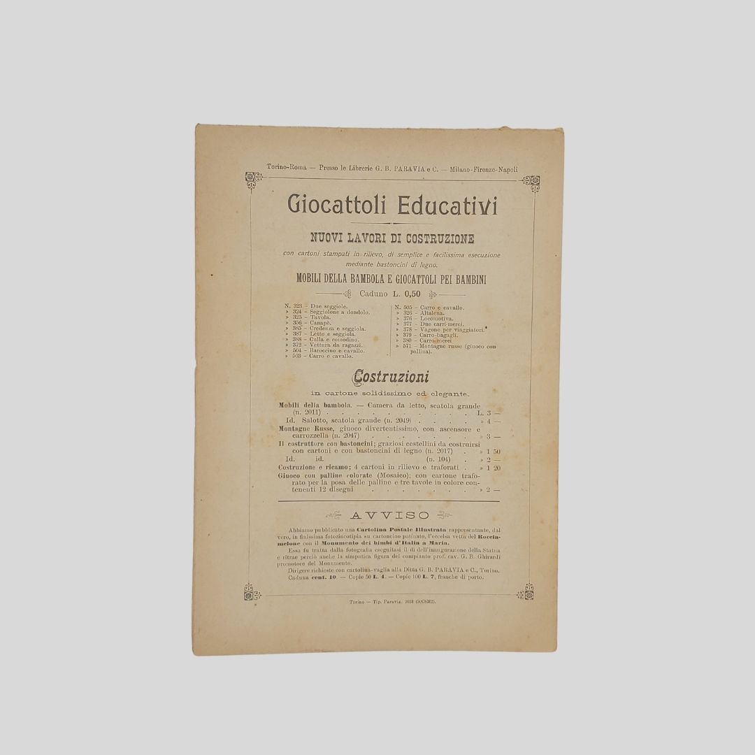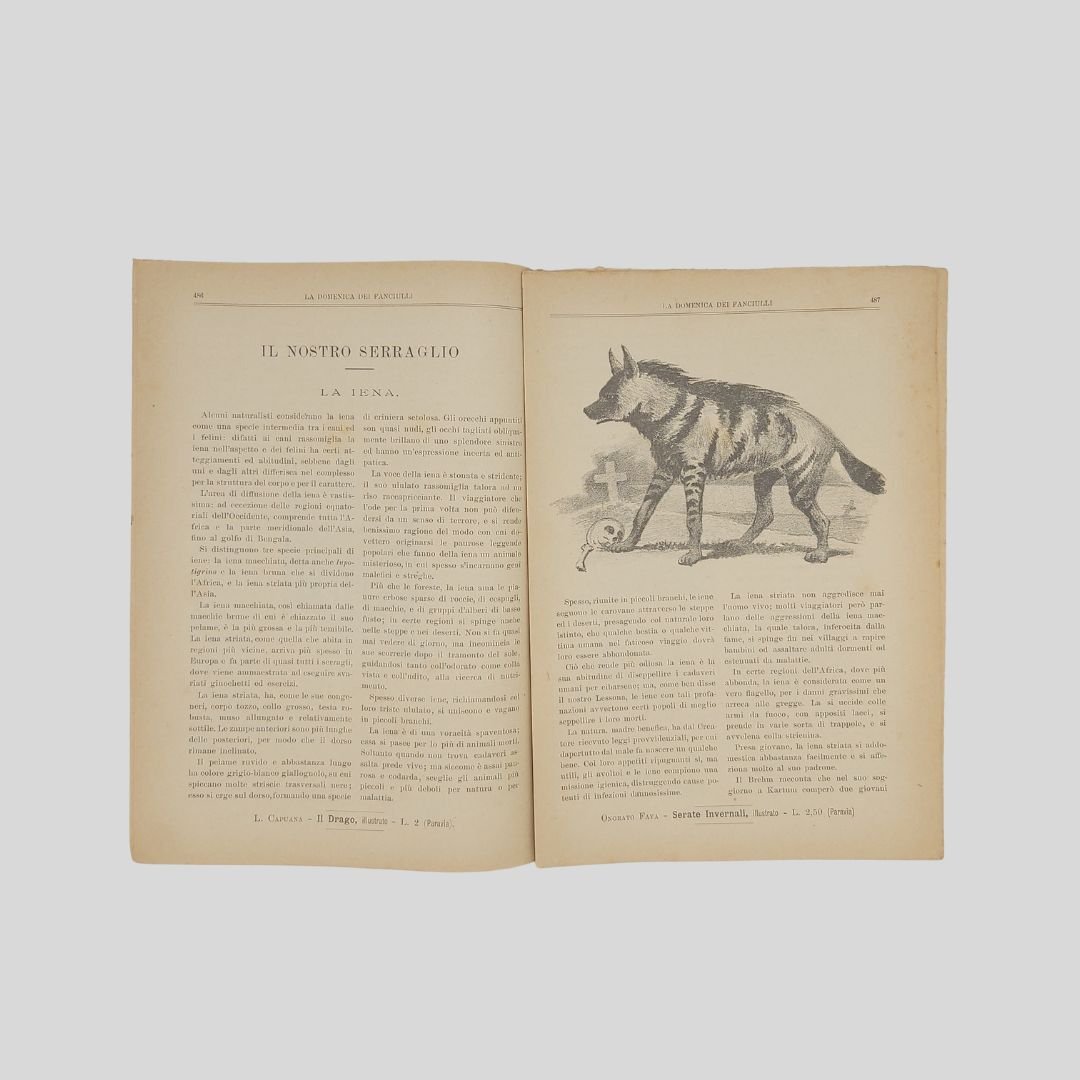 anno II, n. 31, 28 luglio 1901, cm 27×19, pp. 16 (numeraz. continua). Dir. Cecilia Comino. Illustrazioni in bianco e nero e a colori, nel testo e fuori testo e pagine di pubblicità. Da questo numero “Il nostro serraglio”, rubrica sugli animali feroci con illustrazione in bianco e nero. Testata di GIB. Cop. a colori. In buone condizioni. Non comune come tutti i fascicoli del primo e secondo anno. La domenica dei Fanciulli con la testata dalla grafica di gusto liberty e con le innovative copertine costituì uno dei più felici esempi dell’Art Nouveau. Esso dirà ai più piccoli, come ai più grandicelli, tante cosette utili a sapersi ritrarrà scene della vostra vita quotidiana in casa ed in iscuola; vi proporrà giuochi istruttivi, lavoretti geniali; vi narrerà graziose storielle; vi presenterà, come in una lanterna magica, quadri curiosi ed attraenti sui più svariati soggetti. Con l’inizio del ‘900 si vedono ridursi sempre di più le distanze tra artisti e illustratori e avviarsi una capillare diffusione delle riviste stampate con moderni procedimenti fotolitografici. È il caso del settimanale La domenica dei fanciulli, pubblicato a Torino dal 1900 al 1920, un nuovo “giornale settimanale illustrato” per bambini che andava ad affiancarsi ad altre prestigiose testate come Il Giornalino della domenica e Il Corriere dei piccoli e che proseguì le pubblicazioni per un ventennio. Edita da Paravia, fu diretta prima da Cecilia Comino e poi da Luisa Arietti. Tra i collaboratori: Teresa Corrado, T. Gironi, L. Sclaverano, E. Nuccio. Tra gli illustratori: Attilio (Attilio Mussino), Adalbert Begas, Gaido e Giulio Brugo, G. G. Bruno, F. Calmettes, Carlucci, Quinto Cenni, Gech (G. E. Chiarino), Zier (R. de La Neziére), Ch. Parc, L. Pansa.