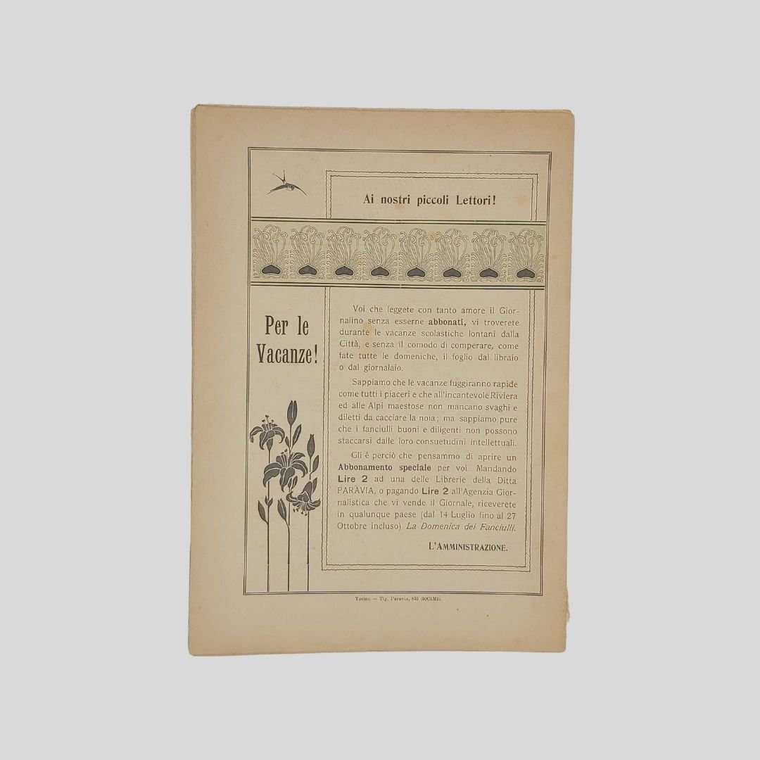 anno II, n. 27, 30 Giugno 1901, cm 27×19, pp. 16 (numeraz. continua). Dir. Cecilia Comino. Illustrazioni in bianco e nero e a colori, nel testo e fuori testo e pagine di pubblicità. Testata di GIB. Cop. a colori. In buone condizioni. Non comune come tutti i fascicoli del primo e secondo anno. La domenica dei Fanciulli con la testata dalla grafica di gusto liberty e con le innovative copertine costituì uno dei più felici esempi dell’Art Nouveau. Esso dirà ai più piccoli, come ai più grandicelli, tante cosette utili a sapersi ritrarrà scene della vostra vita quotidiana in casa ed in iscuola; vi proporrà giuochi istruttivi, lavoretti geniali; vi narrerà graziose storielle; vi presenterà, come in una lanterna magica, quadri curiosi ed attraenti sui più svariati soggetti. Con l’inizio del ‘900 si vedono ridursi sempre di più le distanze tra artisti e illustratori e avviarsi una capillare diffusione delle riviste stampate con moderni procedimenti fotolitografici. È il caso del settimanale La domenica dei fanciulli, pubblicato a Torino dal 1900 al 1920, un nuovo “giornale settimanale illustrato” per bambini che andava ad affiancarsi ad altre prestigiose testate come Il Giornalino della domenica e Il Corriere dei piccoli e che proseguì le pubblicazioni per un ventennio. Edita da Paravia, fu diretta prima da Cecilia Comino e poi da Luisa Arietti. Tra i collaboratori: Teresa Corrado, T. Gironi, L. Sclaverano, E. Nuccio. Tra gli illustratori: Attilio (Attilio Mussino), Adalbert Begas, Gaido e Giulio Brugo, G. G. Bruno, F. Calmettes, Carlucci, Quinto Cenni, Gech (G. E. Chiarino), Zier (R. de La Neziére), Ch. Parc, L. Pansa.