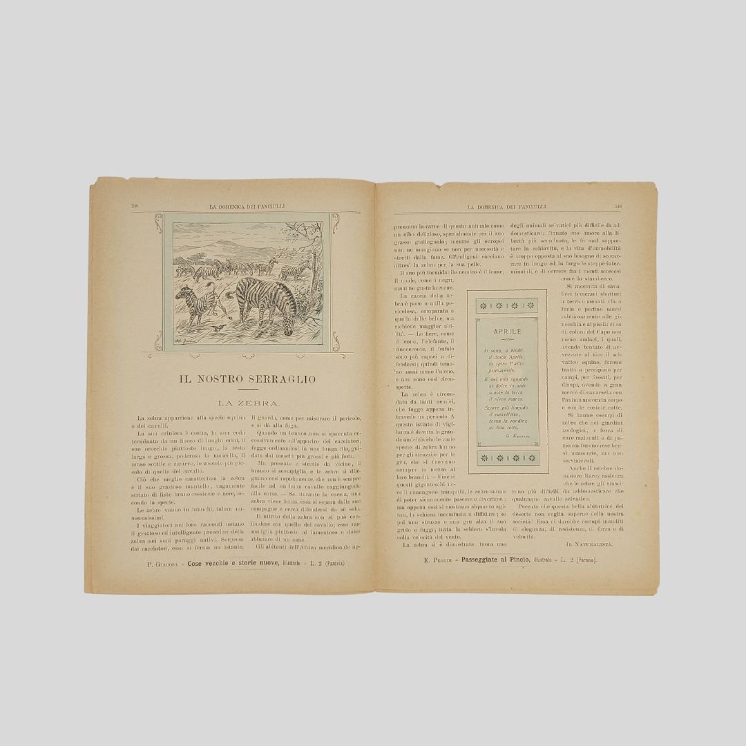 anno II, n. 16, 14 Aprile 1901, cm 27×19, pp. 16 (numeraz. continua). Dir. Cecilia Comino. Illustrazioni in bianco e nero e a colori, nel testo e fuori testo e pagine di pubblicità. Da questo numero “Il nostro serraglio”, rubrica sugli animali feroci con illustrazione in bianco e nero. Testata di GIB. Cop. in bianco e nero di G. G. Bruno. In buone condizioni. Non comune come tutti i fascicoli del primo e secondo anno. La domenica dei Fanciulli con la testata dalla grafica di gusto liberty e con le innovative copertine costituì uno dei più felici esempi dell’Art Nouveau.Esso dirà ai più piccoli, come ai più grandicelli, tante cosette utili a sapersi ritrarrà scene della vostra vita quotidiana in casa ed in iscuola; vi proporrà giuochi istruttivi, lavoretti geniali; vi narrerà graziose storielle; vi presenterà, come in una lanterna magica, quadri curiosi ed attraenti sui più svariati soggetti.Con l’inizio del ‘900 si vedono ridursi sempre di più le distanze tra artisti e illustratori e avviarsi una capillare diffusione delle riviste stampate con moderni procedimenti fotolitografici. È il caso del settimanale La domenica dei fanciulli, pubblicato a Torino dal 1900 al 1920, un nuovo “giornale settimanale illustrato” per bambini che andava ad affiancarsi ad altre prestigiose testate come Il Giornalino della domenica e Il Corriere dei piccoli e che proseguì le pubblicazioni per un ventennio. Edita da Paravia, fu diretta prima da Cecilia Comino e poi da Luisa Arietti. Tra i collaboratori: Teresa Corrado, T. Gironi, L. Sclaverano, E. Nuccio. Tra gli illustratori: Attilio (Attilio Mussino), Adalbert Begas, Gaido e Giulio Brugo, G. G. Bruno, F. Calmettes, Carlucci, Quinto Cenni, Gech (G. E. Chiarino), Zier (R. de La Neziére), Ch. Parc, L. Pansa.