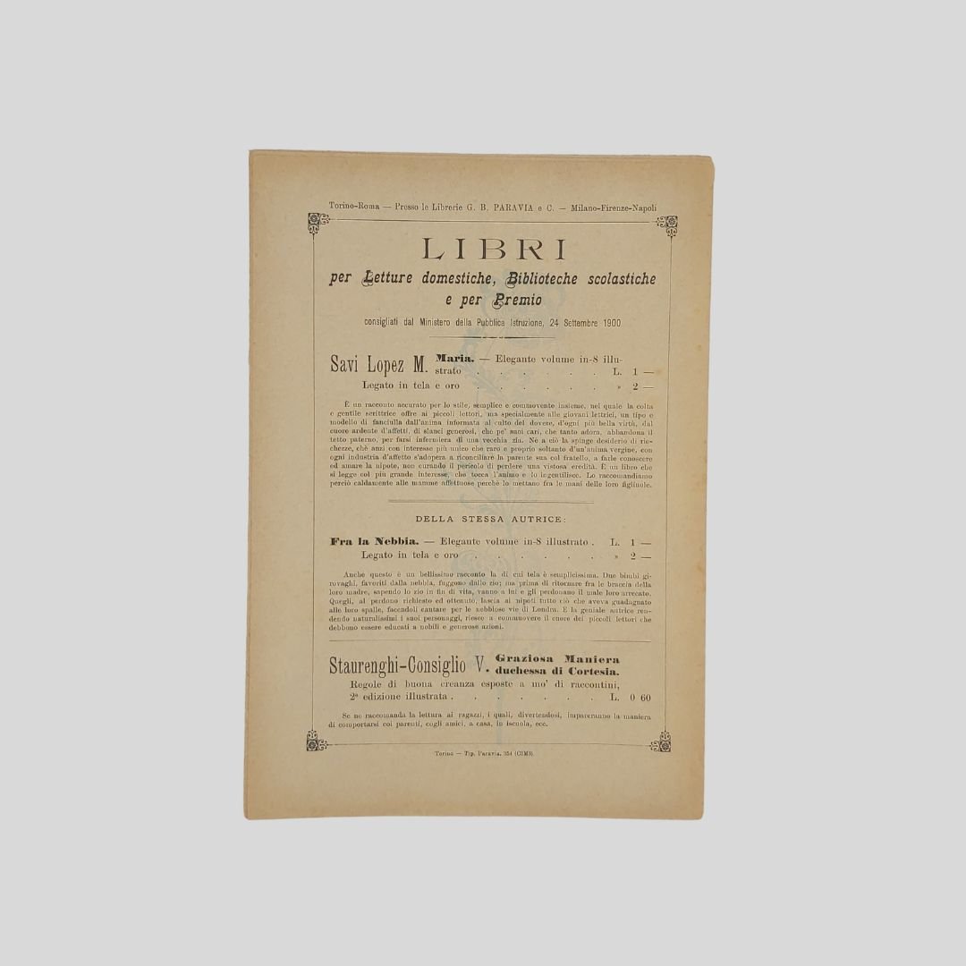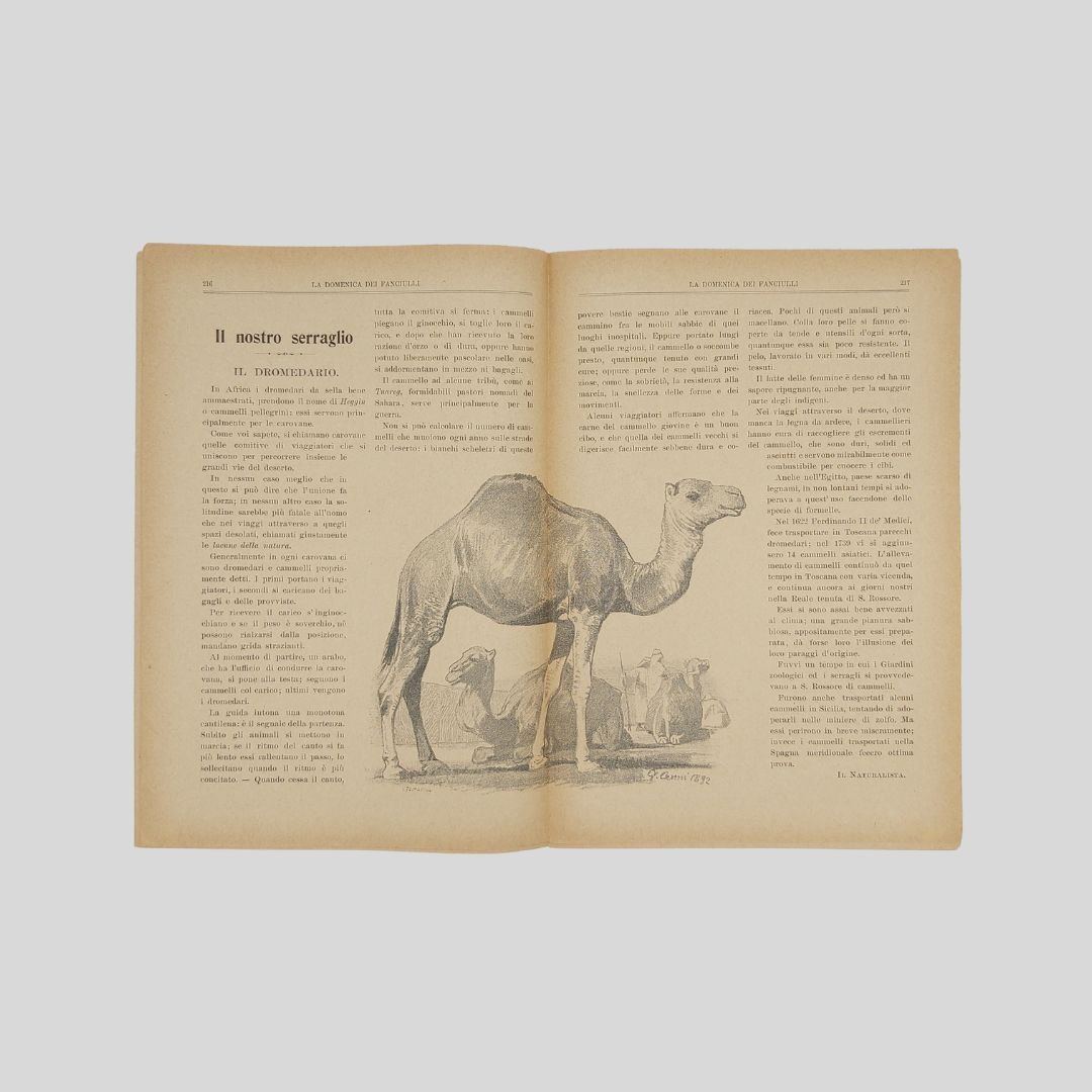 anno II, n.14, 31 marzo 1901, cm 27×19, pp. 16 (numeraz. continua). Dir. Cecilia Comino. Illustrazioni in bianco e nero e a colori, nel testo e fuori testo e pagine di pubblicità. Da questo numero “Il nostro serraglio”, rubrica sugli animali feroci con illustrazione in b.n di Q. Cenni. Testata di GIB. Cop. a colori. In buone condizioni. Non comune come tutti i fascicoli del primo e secondo anno. La domenica dei Fanciulli con la testata dalla grafica di gusto liberty e con le innovative copertine costituì uno dei più felici esempi dell’Art Nouveau. Esso dirà ai più piccoli, come ai più grandicelli, tante cosette utili a sapersi ritrarrà scene della vostra vita quotidiana in casa ed in iscuola; vi proporrà giuochi istruttivi, lavoretti geniali; vi narrerà graziose storielle; vi presenterà, come in una lanterna magica, quadri curiosi ed attraenti sui più svariati soggetti.<BR>Con l’inizio del ‘900 si vedono ridursi sempre di più le distanze tra artisti e illustratori e avviarsi una capillare diffusione delle riviste stampate con moderni procedimenti fotolitografici. È il caso del settimanale La domenica dei fanciulli, pubblicato a Torino dal 1900 al 1920, un nuovo “giornale settimanale illustrato” per bambini che andava ad affiancarsi ad altre prestigiose testate come Il Giornalino della domenica e Il Corriere dei piccoli e che proseguì le pubblicazioni per un ventennio. Edita da Paravia, fu diretta prima da Cecilia Comino e poi da Luisa Arietti. Tra i collaboratori: Teresa Corrado, T. Gironi, L. Sclaverano, E. Nuccio. Tra gli illustratori: Attilio (Attilio Mussino), Adalbert Begas, Gaido e Giulio Brugo, G. G. Bruno, F. Calmettes, Carlucci, Quinto Cenni, Gech (G. E. Chiarino), Zier (R. de La Neziére), Ch. Parc, L. Pansa.