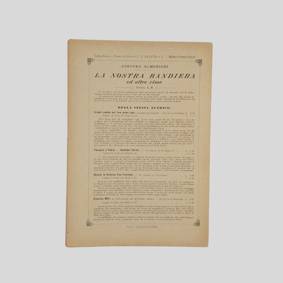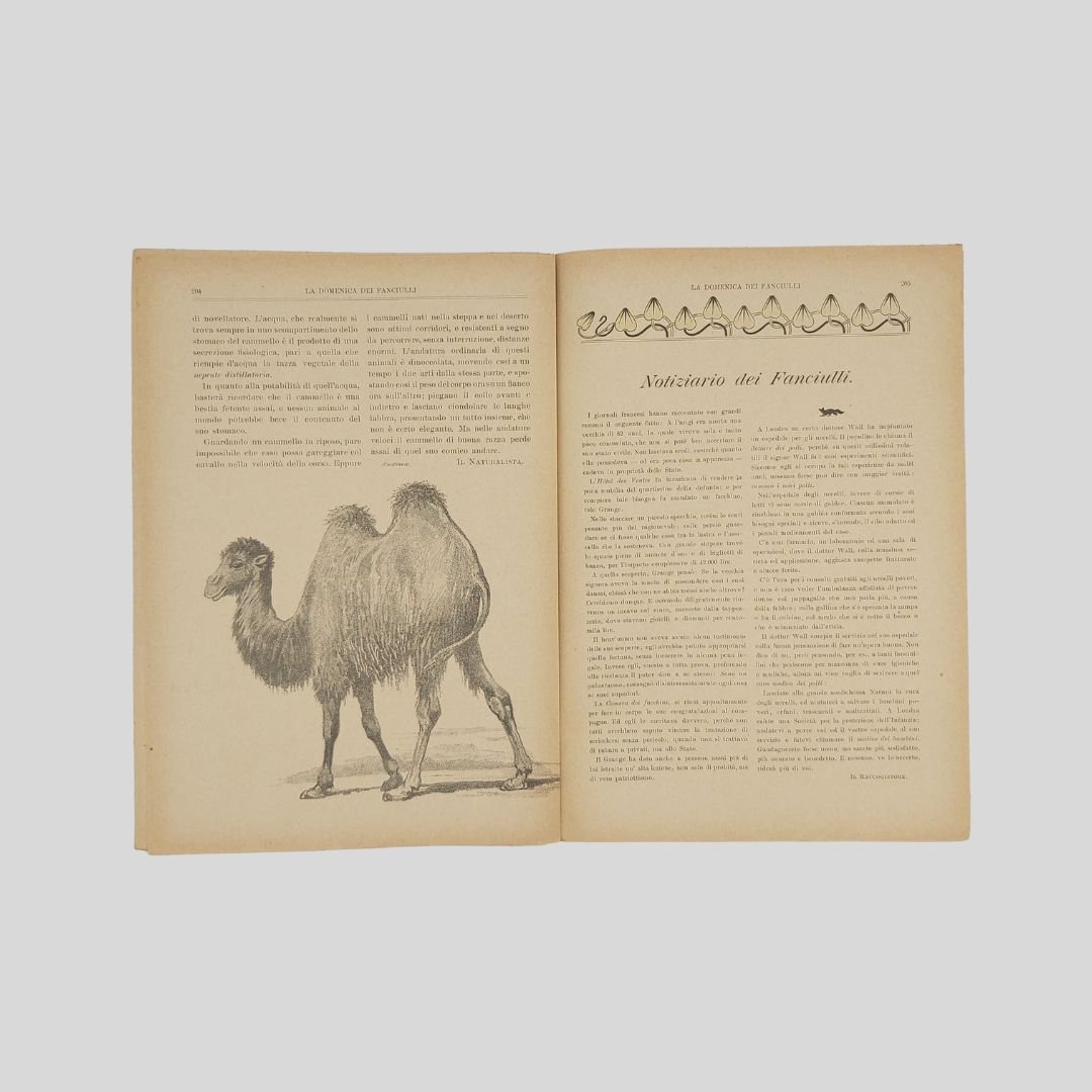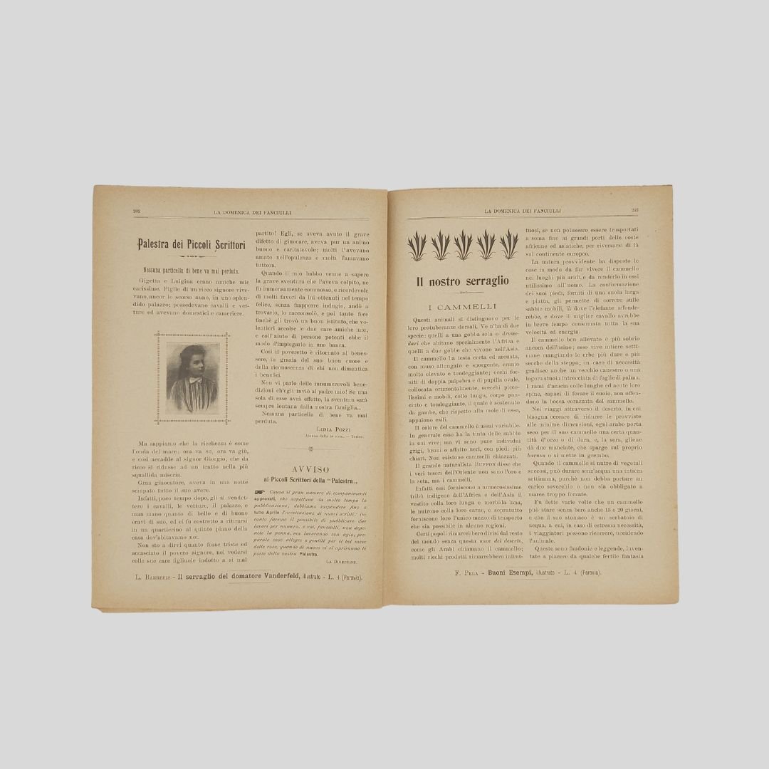 anno II, n.13, 24 marzo 1901, cm 27×19, pp. 16 (numeraz. continua). Dir. Cecilia Comino. Illustrazioni in bianco e nero e a colori, nel testo e fuori testo e pagine di pubblicità. Da questo numero “Il nostro serraglio”, rubrica sugli animali feroci. Testata di GIB. Cop. in b.n. di V. Turati. In buone condizioni. Non comune come tutti i fascicoli del primo e secondo anno. a domenica dei Fanciulli con la testata dalla grafica di gusto liberty e con le innovative copertine costituì uno dei più felici esempi dell’Art Nouveau. Esso dirà ai più piccoli, come ai più grandicelli, tante cosette utili a sapersi ritrarrà scene della vostra vita quotidiana in casa ed in iscuola; vi proporrà giuochi istruttivi, lavoretti geniali; vi narrerà graziose storielle; vi presenterà, come in una lanterna magica, quadri curiosi ed attraenti sui più svariati soggetti.Con l’inizio del ‘900 si vedono ridursi sempre di più le distanze tra artisti e illustratori e avviarsi una capillare diffusione delle riviste stampate con moderni procedimenti fotolitografici. È il caso del settimanale La domenica dei fanciulli, pubblicato a Torino dal 1900 al 1920, un nuovo “giornale settimanale illustrato” per bambini che andava ad affiancarsi ad altre prestigiose testate come Il Giornalino della domenica e Il Corriere dei piccoli e che proseguì le pubblicazioni per un ventennio. Edita da Paravia, fu diretta prima da Cecilia Comino e poi da Luisa Arietti. Tra i collaboratori: Teresa Corrado, T. Gironi, L. Sclaverano, E. Nuccio. Tra gli illustratori: Attilio (Attilio Mussino), Adalbert Begas, Gaido e Giulio Brugo, G. G. Bruno, F. Calmettes, Carlucci, Quinto Cenni, Gech (G. E. Chiarino), Zier (R. de La Neziére), Ch. Parc, L. Pansa. V. Turati.