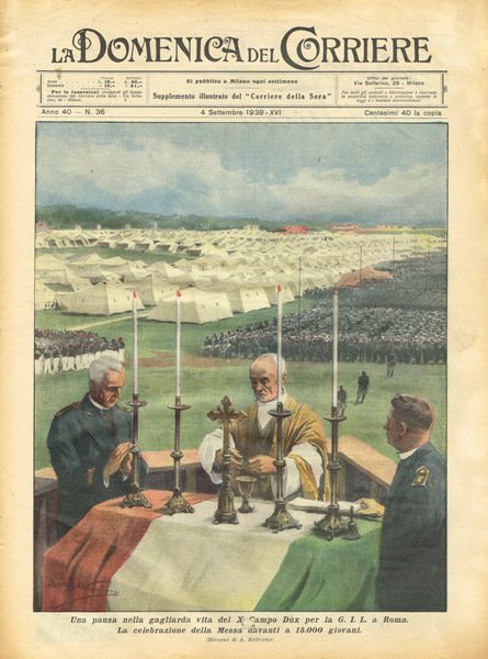 Fascicolo settimanale suppl.to del Corriere della Sera, 4 sett.1938, copertina editoriale illustrata con disegni a colori di A.Beltrame, ingiallita, con strappetti ai bordi, piccola mancanza al piatto ant., strappo con mancanza all'angolo inf.post., pagine ingiallite, con illustrazioni nei testi e strappetti ai bordi. Numero pagine 15