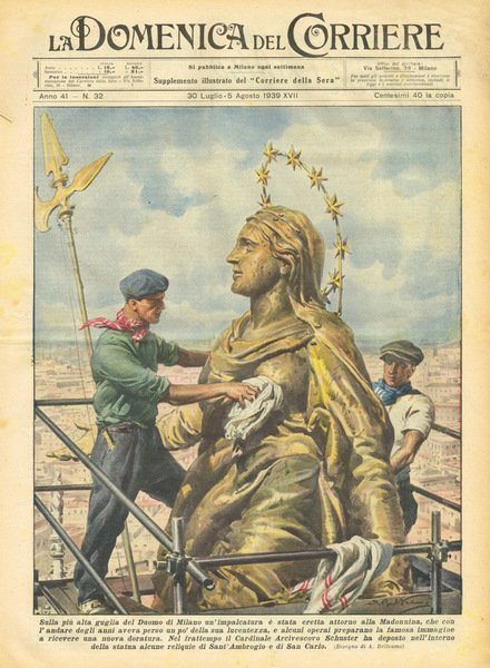 Fascicolo settimanale suppl.to del Corriere della Sera, 30 luglio-5 agosto 1939, copertina editoriale illustrata con disegni a colori di A.Beltrame, ingiallita e con fioritura, ulteriore copertina celeste, ingiallita, scolorita, con fioritura e strappi al dorsetto, spillatura saltata, pagine ingiallite, con illustrazioni nei testi e fioritura. Numero pagine 15