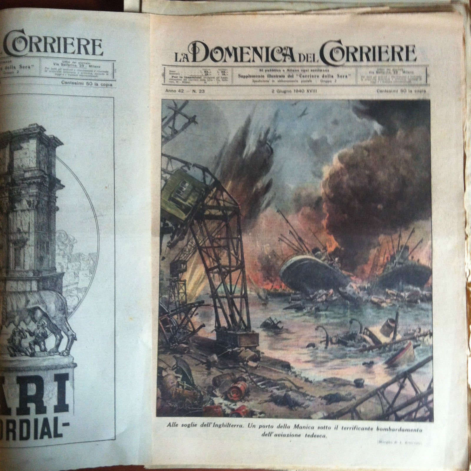 La Domenica del CorriereAll'interno disegno di A. Beltrame: Alle soglie dell'Inghilterra, un porto della Manica sotto bombardamento tedescoLe avvanguardie tedesche conquistano un bosco in FranciaIn buono stato (50 g)E7240