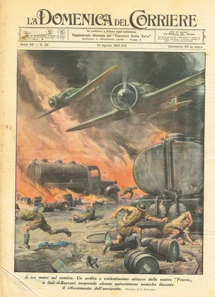 Fascicolo settimanale suppl.to del Corriere della Sera, 10 agosto 1941, copertina editoriale illustrata con disegni a colori di A.Beltrame, ingiallita, con fioritura, spillatura inf.saltata, con alcune pieghe, usura e strappi al dorsetto, pagine ingiallite, con illustrazioni nei testi, fioritura e strappetti ai bordi. Numero pagine 11