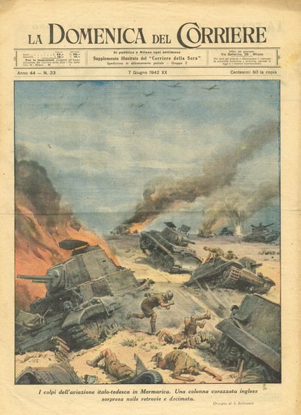 Fascicolo settimanale suppl.to del Corriere della Sera, 7 giu.1942, copertina editoriale illustrata con disegni a colori di A.Beltrame, ingiallita, con fioritura, aloni e strappetti ai bordi, ulteriore copertina scolorita, ingiallita, con fioritura, piega al piatto ant.e strappi al dorsetto, pagine ingiallite, con fioritura, illustrazioni in nero nei testi e strappetti ai bordi. Numero pagine 7