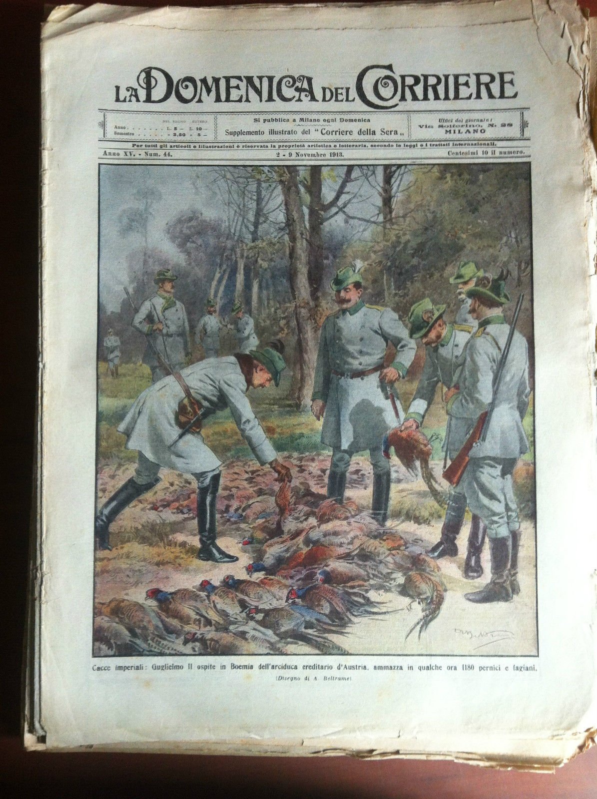 La Domenica del CorriereAll'interno disegno di A. Beltrame: Bombardamento sul ghiaccioCacce Imperiali in BoemiaGabbia di leoni fuggono in una via di LipsiaIn buono stato salvo piccoli strappi margini (50 g)E9430