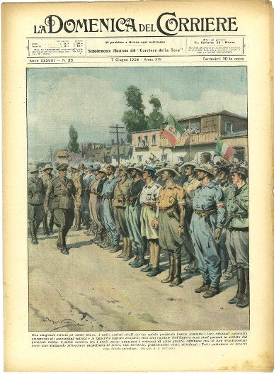 Fascicolo originale e completo. Disegno di A. Beltrame. -- Una singolare rivista ad Addis Abeba. I mille autisti civili che tra epiche peripezie hanno condotto i loro colossali autocarri attraverso gli asprissimi valichi o le impervie regioni etiopiche fino alla capitale dell'Impero sono stati passati in rivista dal generale Gabba. I mille uomini, tra i quali erano numerosi i veterani di altre guerre, offrivano con le loro svariatissime fogge uno spettacolo pittoresco: cappellacci di feltro, tute turchine, pantaloncini corti, stivaloni. Tutti portavano al braccio una fascia tricolore.
