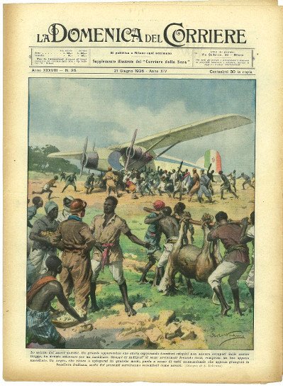Fascicolo originale e completo. Disegno di A. Beltrame. -- Lo spirito dei nuovi sudditi. Un grande apparecchio che stava esplorando territori etiopici non ancora occupati dalle nostro truppe, ha dovuto atterrare por un incidente. Gruppi di indigeni si sono avvicinati recando doni, compreso un bue appena macellato. Un negro, che riesce a spiegarsi in qualche modo, parla a nome di tutti annunciando che appena giungerà la bandiera italiana, molti dei presenti serviranno volentieri come ascari.