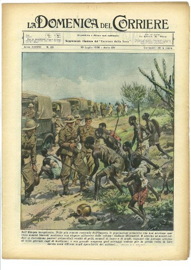 Fascicolo originale e completo. Disegno di A. Beltrame. - Nell'Etiopia inesplorata. Nelle più remote contrade dell'Impero, le popolazioni primitive che non avevano mai visto uomini bianchi assistono con stupore all'arrivo delle colonna italiane liberatrici. E attorno ai nostri soldati si raccolgono pastori primordiali vestiti di pelli, armati di lance e di scudi, ragazzi che portano attorno al collo giovani capi di bestiame; e con grande sorpresa quei selvaggi vedono per la prima volta la loro faccia nera riflessa negli specchietti dei militari.