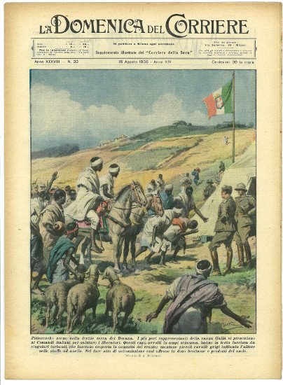Fascicolo originale e completo. Disegno di A. Beltrame. - Pittoresche scene nella fertile terra dei Borana. I più puri rappresentanti della razza Galla si presentano ai Comandi italiani per salutare i liberatori. Questi capi, avvolti in ampi sciamma, hanno la testa fasciata da singolari turbanti, che lasciano scoperta la sommità del cranio; montano piccoli cavalli grigi Infilando nelle staffe ad anello. Nel fare atto di sottomissione essi offrono in dono bestiame e prodotti del suolo.