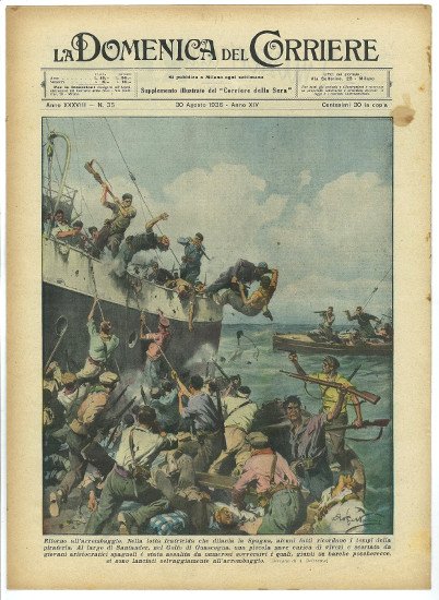 Fascicolo originale e completo. Disegno di A. Beltrame. - Ritorno all'arrembaggio. Nella lotta fratricida che dilania la Spagna, alcuni fatti ricordano i tempi della pirateria. Al largo di Santander, nel Golfo di Guascogna, una piccola nave carica di viveri e scortata da giovani aristocratici spagnoli è stata assalita da numerosi sovversivi i quali, giunti su barche pescherecce, si sono lanciati selvaggiamente all'arrembaggio.