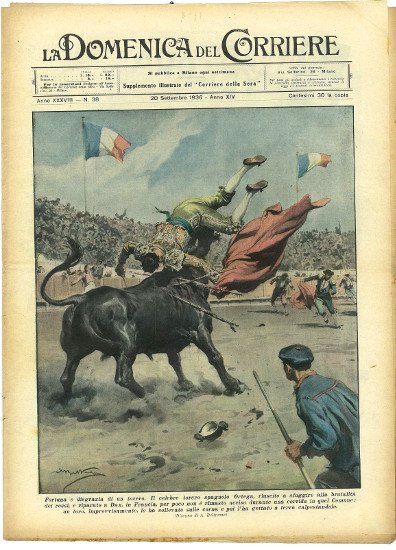 Fascicolo originale e completo. Disegno di A. Beltrame. - Fortuna e disgrazia di un torero. Il celebre torero spagnolo Ortega, riuscito a sfuggire alla brutalità dei rossi, e riparato a Dax, in Francia, per poco non è rimasto ucciso durante una corrida in quel Comune: un toro, improvvisamente, Io ha sollevato sulle corna e poi l'ha gettato a terra calpestandolo.